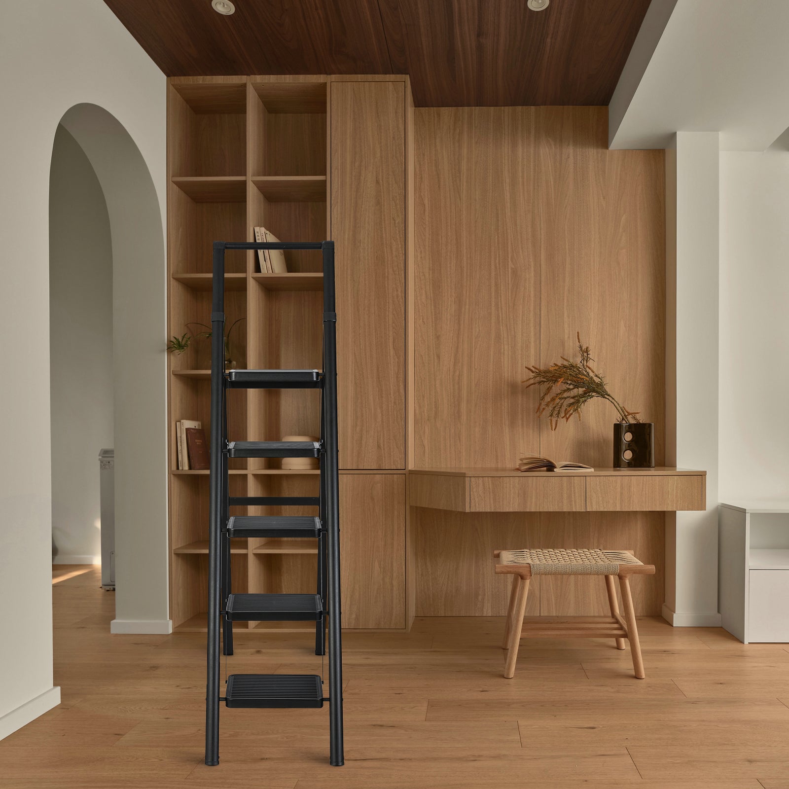 This is a perfect step ladder 5 step folding, great for kitchen, bathroom, office or garage, whether indoors or outdoors. Reaching high into cabinets, changing light bulbs or cleaning windows can all be done with the help of a closet ladder. With its delicate and beautiful appearance, the 5 step ladder can be used as a decorative ladder for bookshelves, planters and more. It can also be taken along on outdoor trips to complete overhead climbing.