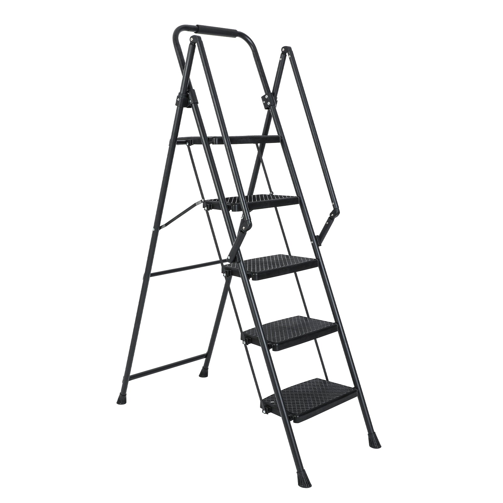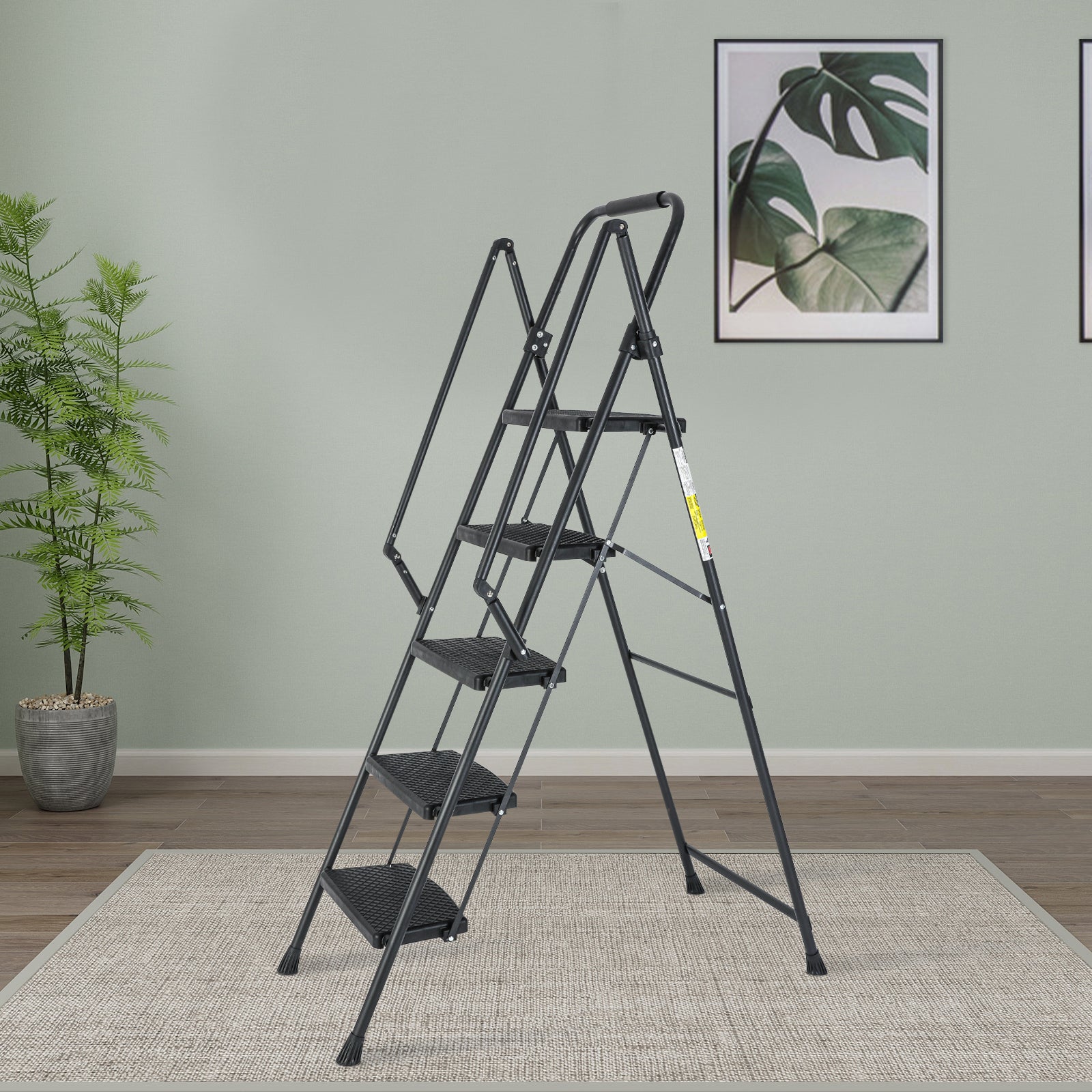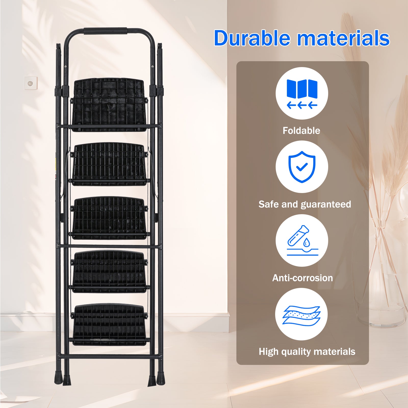 5-Step Steel Folding Step Stool Ladder with Wide Anti Slip Pedal and Safety Handle, Black