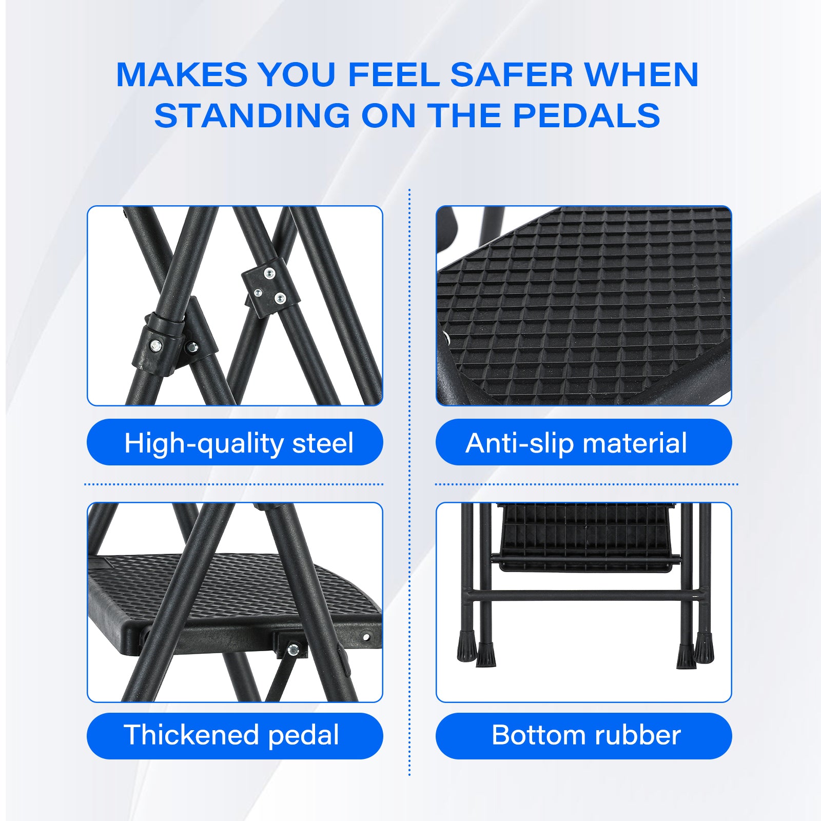 - High-strength steel frame structure is firm and reliable, and the 4-anti slip pads have strong traction, allowing you to easily climb the steel ladder stool, while still providing you with good support and security