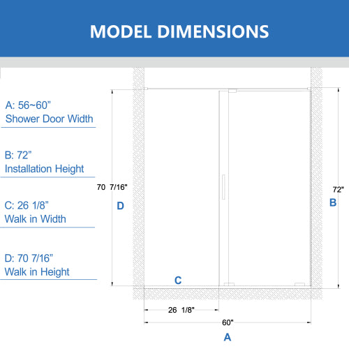 - 【Adjustable Design】This glass shower door 60" width and 72" high, the width can be adjusted from 56" to 60" by cutting guide.
