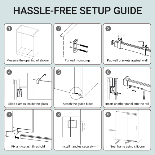 - Left or Right-Side Flexible Installation: The shower door's movable glass panel allows installation on either the left or right side, adapting seamlessly to various bathroom layouts. A detailed installation manual and step-by-step instructional video ensure a smooth setup process. Shipped in impact-tested, reinforced packaging, the product ensures safe, damage-free delivery.