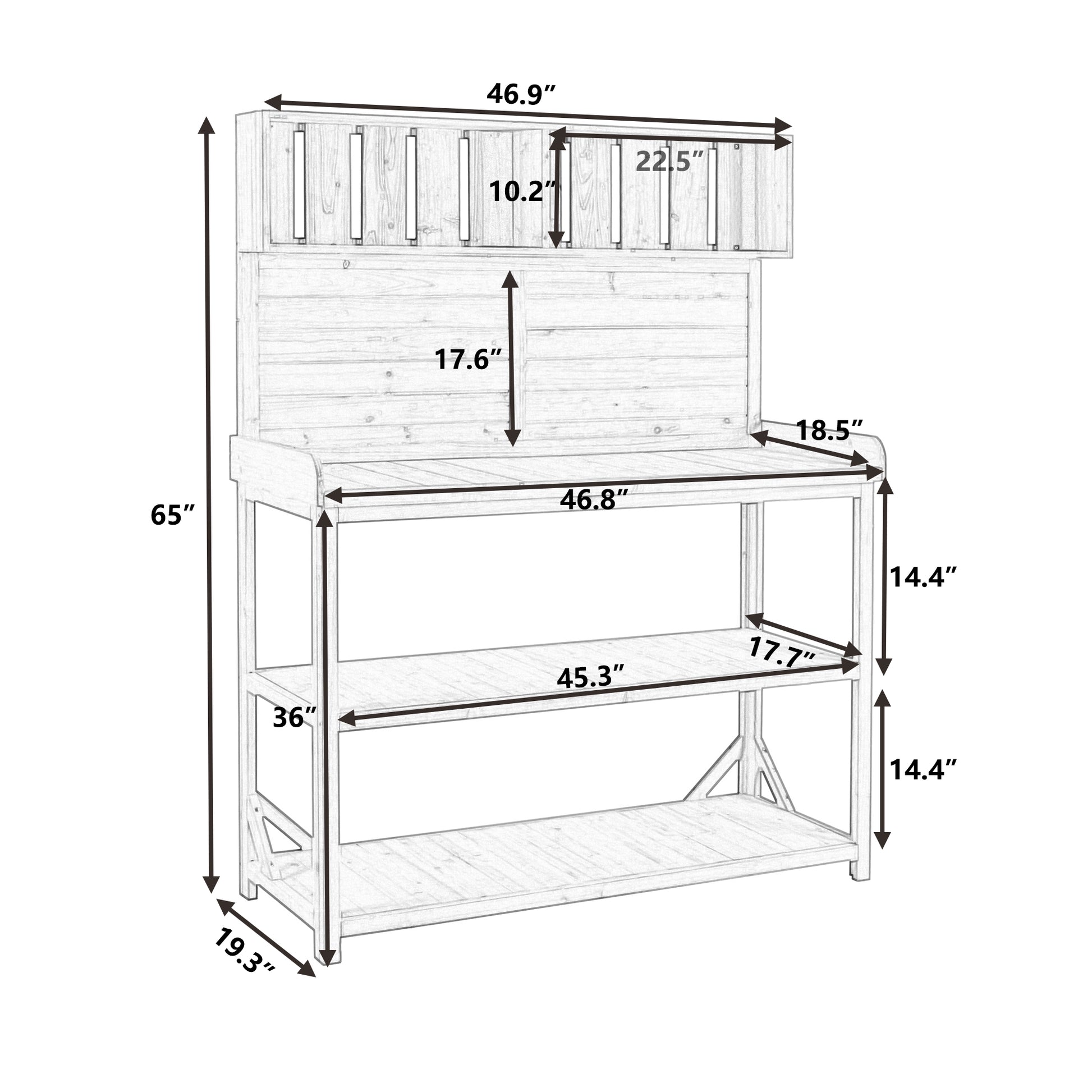 - [Spacious Workstation] Who's ready for Spring? Get a little bit of inspiration for the coming season from this farmhouse garden potting bench. Made of 100% fir wood, this table is sturdy enough for outdoor using with its 46.8x18.5inch workstation. Compared with other potting bench, its surface is spacious for putting many tools or planters from your loved garden.