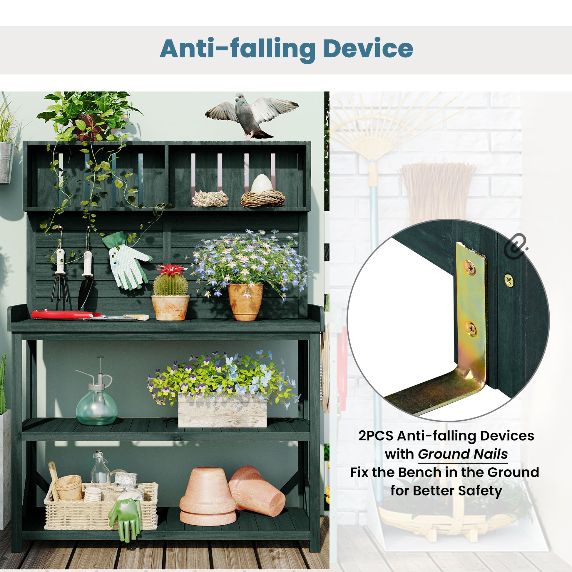 - [Anti-Falling Safety Device] There is not always flat in the garden. For your safety in setting the potting bench, it is designed with an anti-falling device. There are two anti-falling devices with ground nails which can fix the bench in the ground for better safety.