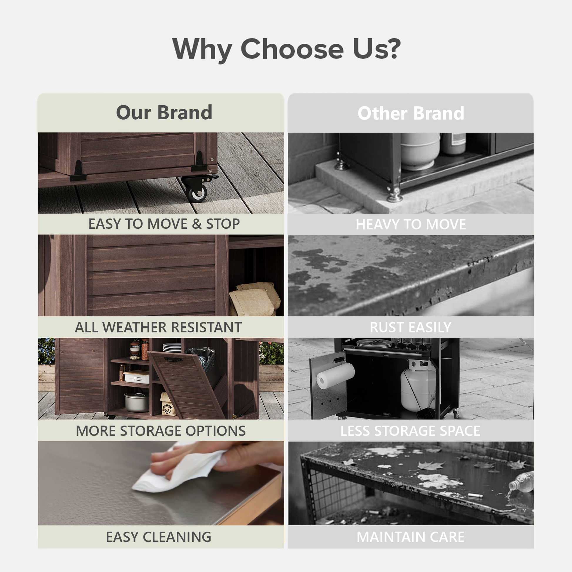 - [Heavy Duty Structure] Crafted from 100% exquisite fir wood, this outdoor bar cart exudes natural charm while prioritizing skin-friendliness and minimal chemical coatings. The 1.2-inch thick 201 stainless steel tabletop offers an easy-to-clean and durable spacious grill table for preparing food ready for cooking. Exclusively designed for your house, we guarantee a long-lasting and sturdy product.