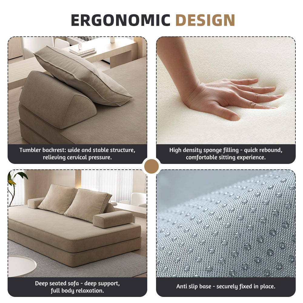 - 【Multi Functional Sofa】Paired with 2 tumbler backrests, 2 pillows and 2 armrests, this innovative and flexible design allows for easy reconfiguration into sofas, chaise lounge, sofa beds, and game mats, achieving personalized customization. This DIY setup is very suitable for different room layouts, living rooms, bedrooms, offices, game halls, and home theaters.