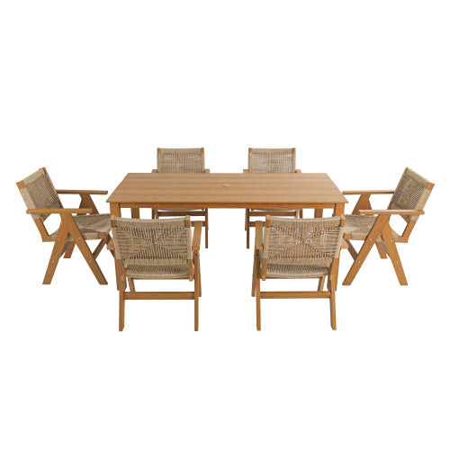 A wooden-textured imitation wood dining table, simple yet with a high quality feel. It has a small tabletop and is perfect for outdoor picnics. It is made of teak wood, measuring 68.9 inches.