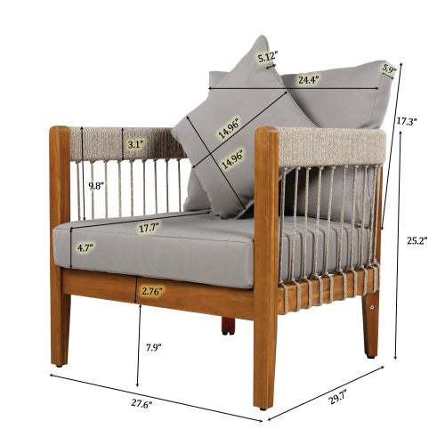 Acacia Wood Outdoor Club Chair with Handwoven Rope Accents & Curved Backrest - Water-Resistant Boho Patio Lounge Chair with Removable Cushions for Porch, Garden