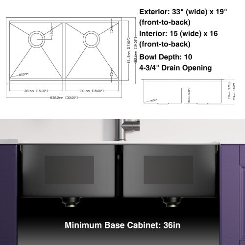 - 33 in. L x 19 in. W x 10 in. D.Undermount sink installation, Double Bowl kitchen sink. minimum cabinet width 36 in.