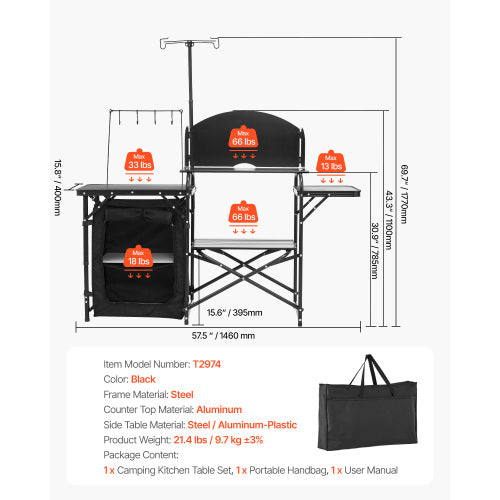 - Great Space Management: Our camping kitchen table is designed to take your kitchen outside! You can organize your food, stoves, grills, and cookware in an orderly manner on the tabletop, zippered storage compartments, side table, and storage shelf. You can hang the spatula, ladle, tongs, etc on the hooks