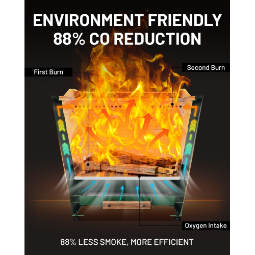- Low Smoke Design: Smokeless Fire Pit features scientific internal airflow system and double wall design with top vent holes for oxygen to feed the fire from below, promotes better airflow and secondary combustion, provides you with a clean flame atmosphere. No more eye-stinging smoke, increase combustion efficiency by 88% compared with other stoves