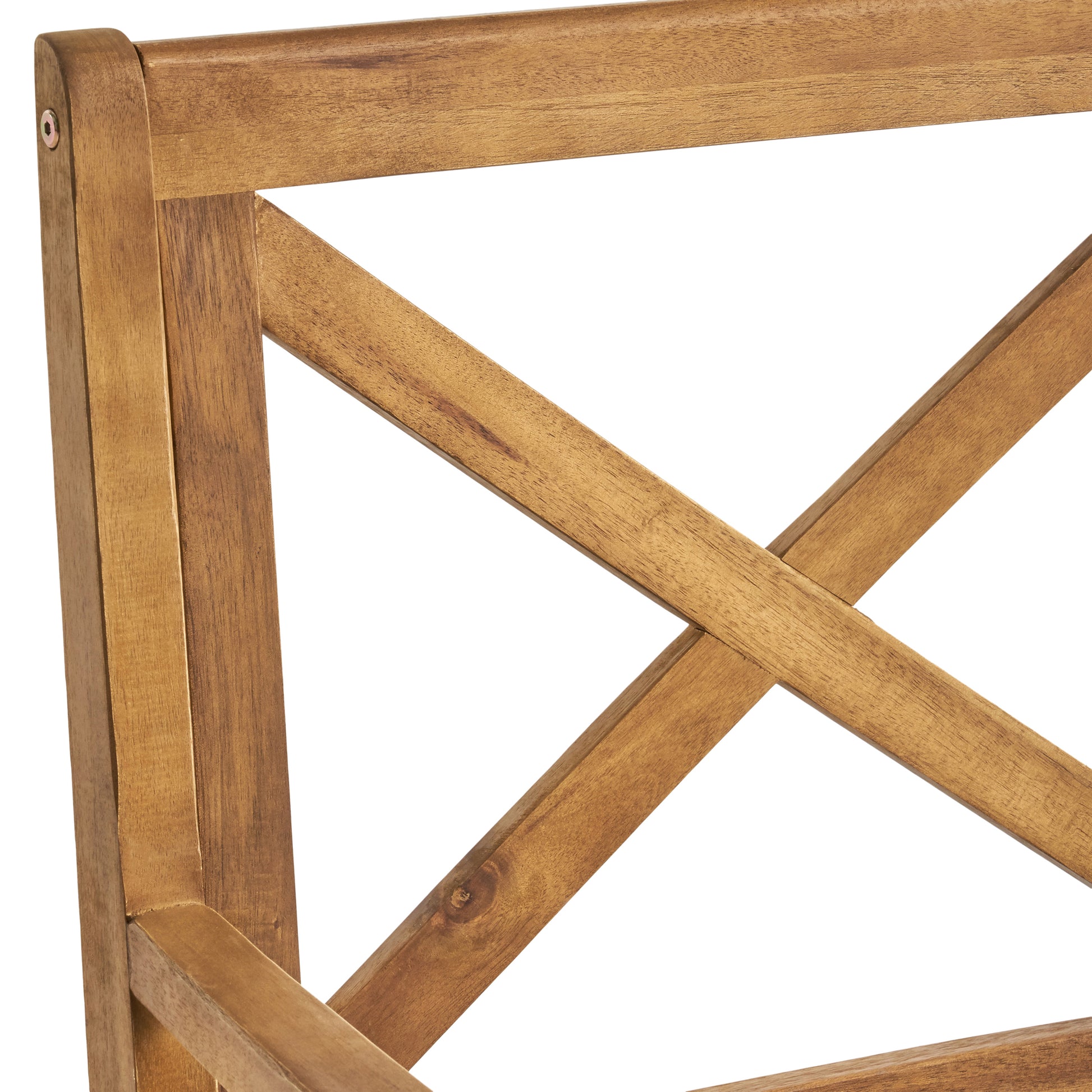 - Classic Wooden Design with a Twist: Enhance your patio dining set with these wooden-armed chairs featuring a sleek wood finish and a pop of blue cushions, adding a refreshing touch to your outdoor space.