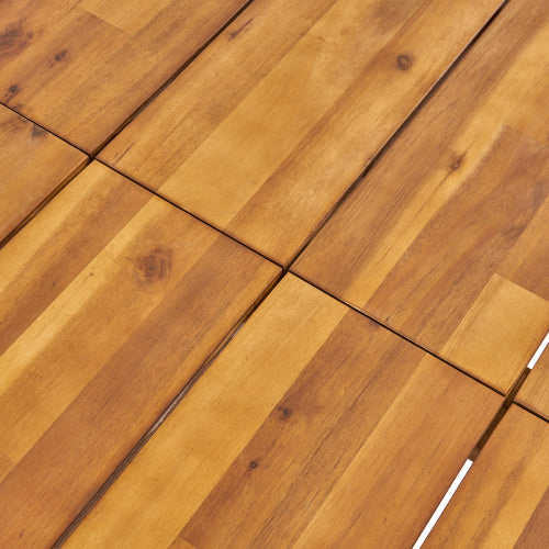 - In a daring combination of acacia wood and iron, this modern outdoor dining table will be sure to please all those invited to enjoy a meal together over it.