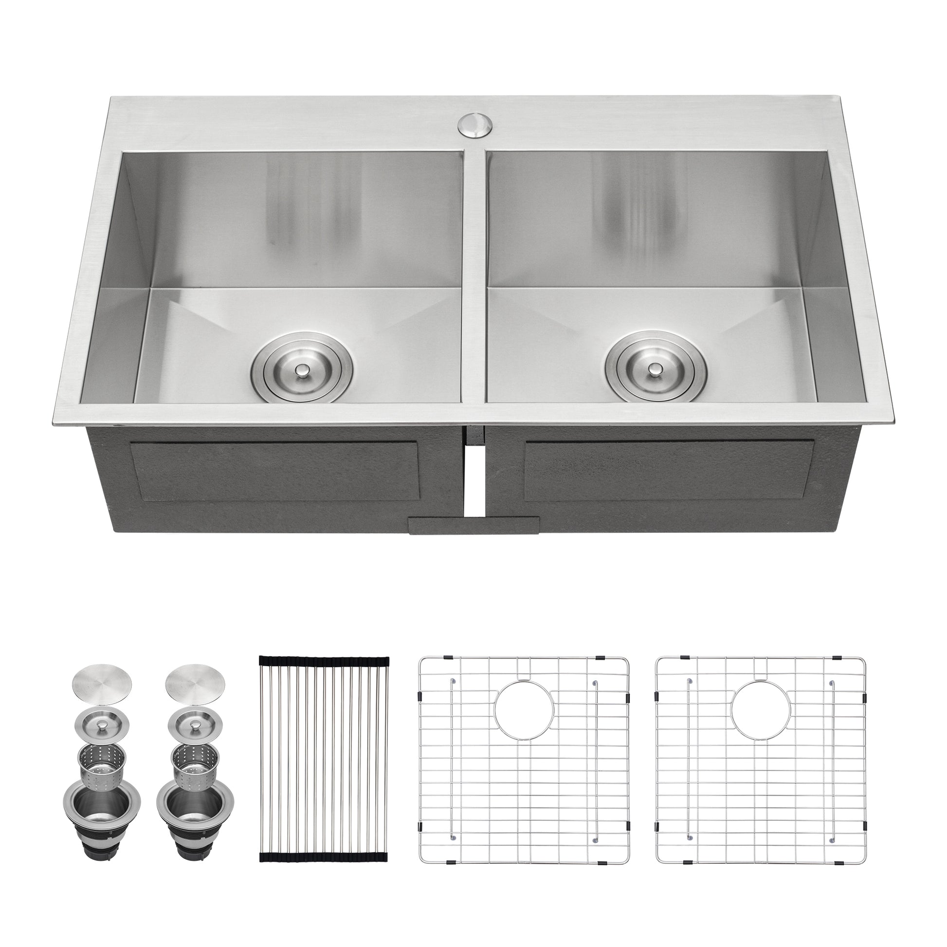 - [Package Includes] Package comes in farmhouse kitchen sink:2 x 304 stainless steel dish grid, 2 x drain assembly, 1 x drying rack,1 x installation clips, 1 x cutout template and installation Guide.