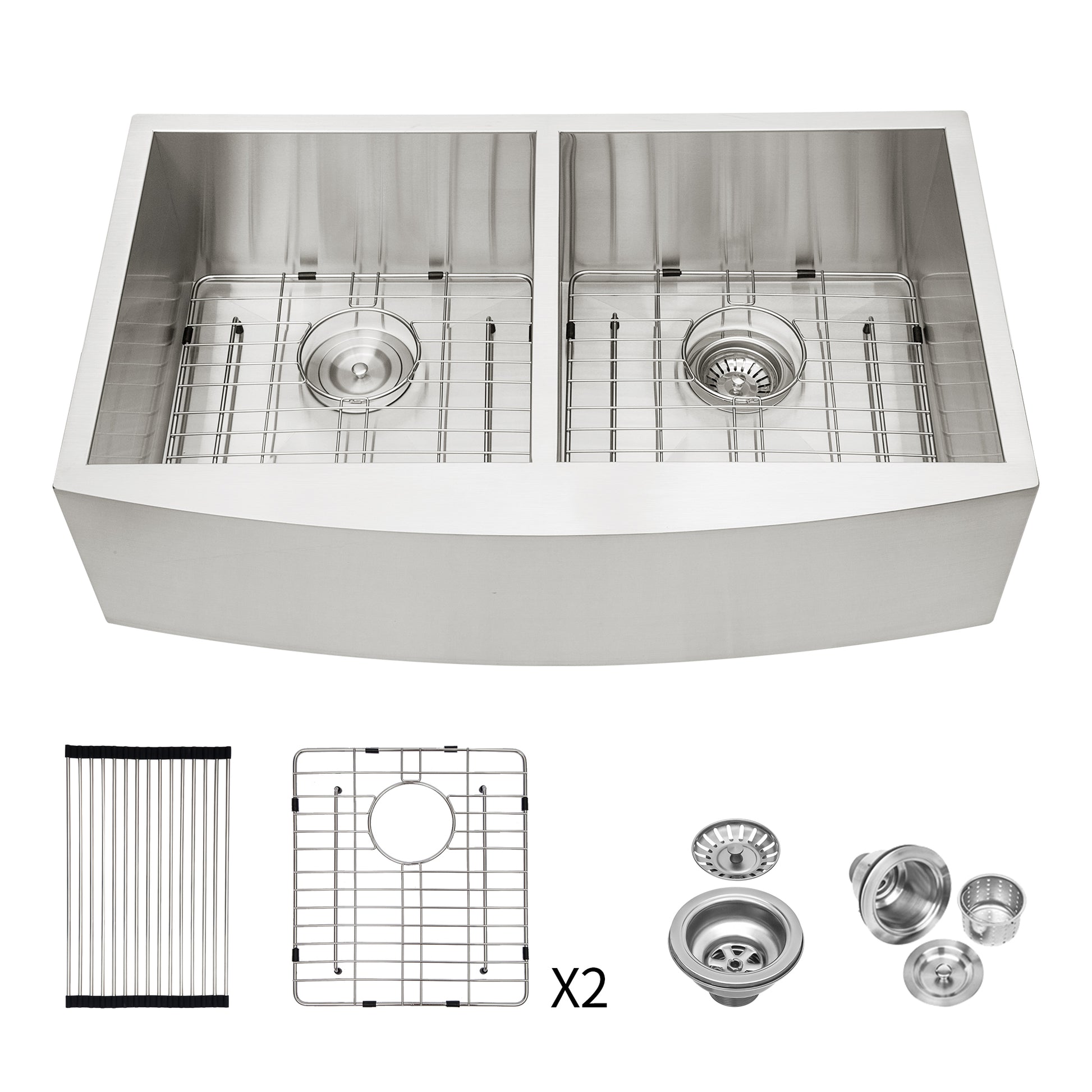 - [Package Includes] Package comes in farmhouse kitchen sink:2 x 304 stainless steel dish grid, 2 x drain assembly, 1 x drying rack,1 x installation clips, 1 x cutout template and installation Guide.