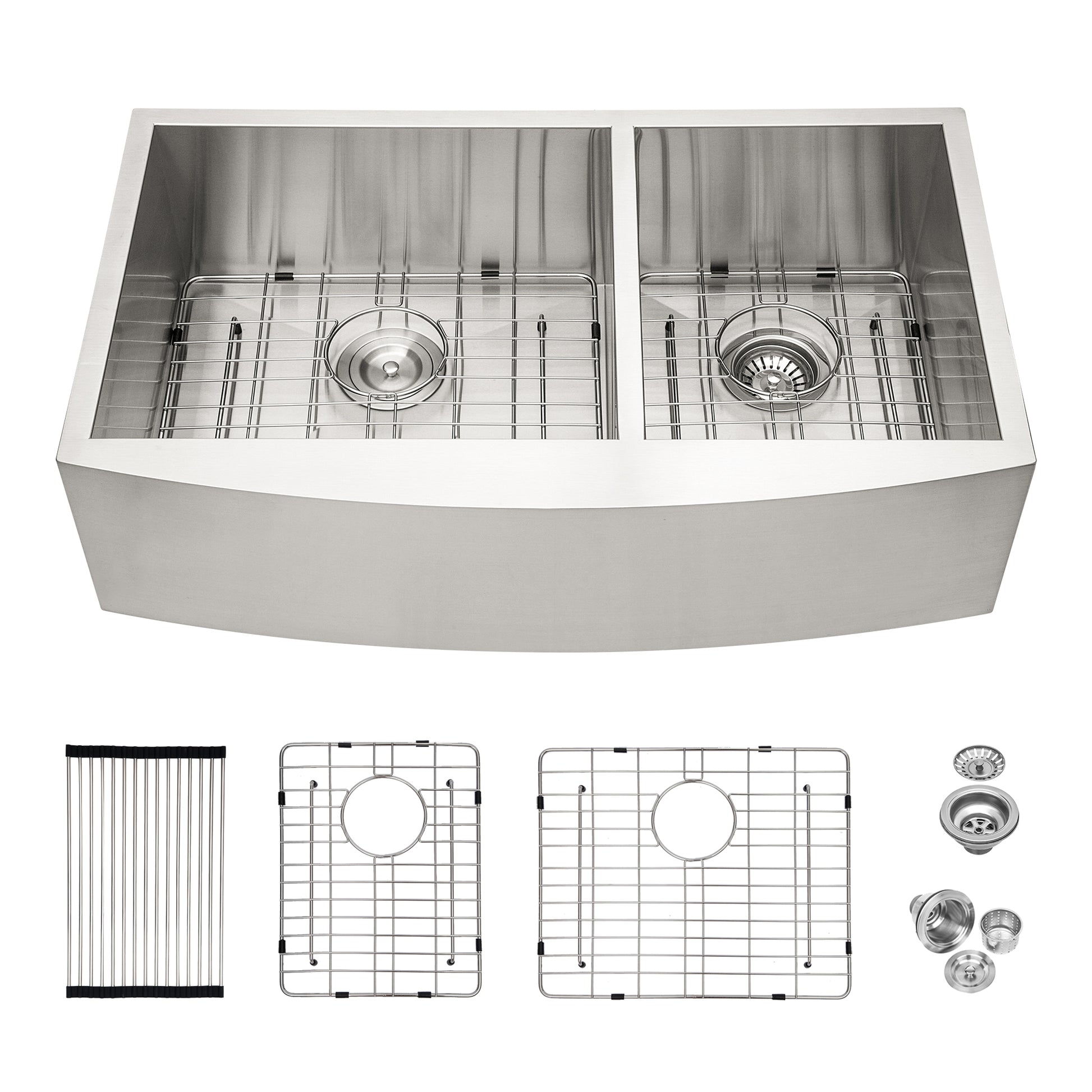 - [Package Includes] Package comes in farmhouse kitchen sink:2 x 304 stainless steel dish grid, 2 x drain assembly, 1 x drying rack,1 x installation clips, 1 x cutout template and installation Guide.