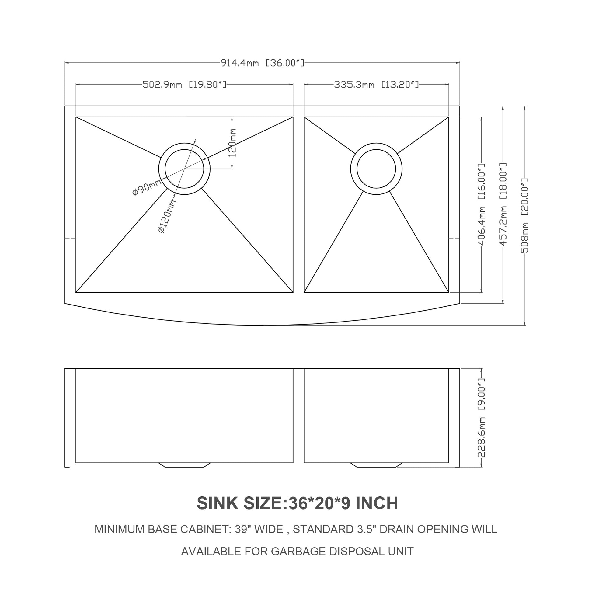 - [Dimensions] Sink Size:36 x 20 x 9 inch , Minimum cabinet size is 39 inch.Standard 3.5" drain openings will fit any garbage disposal unit.