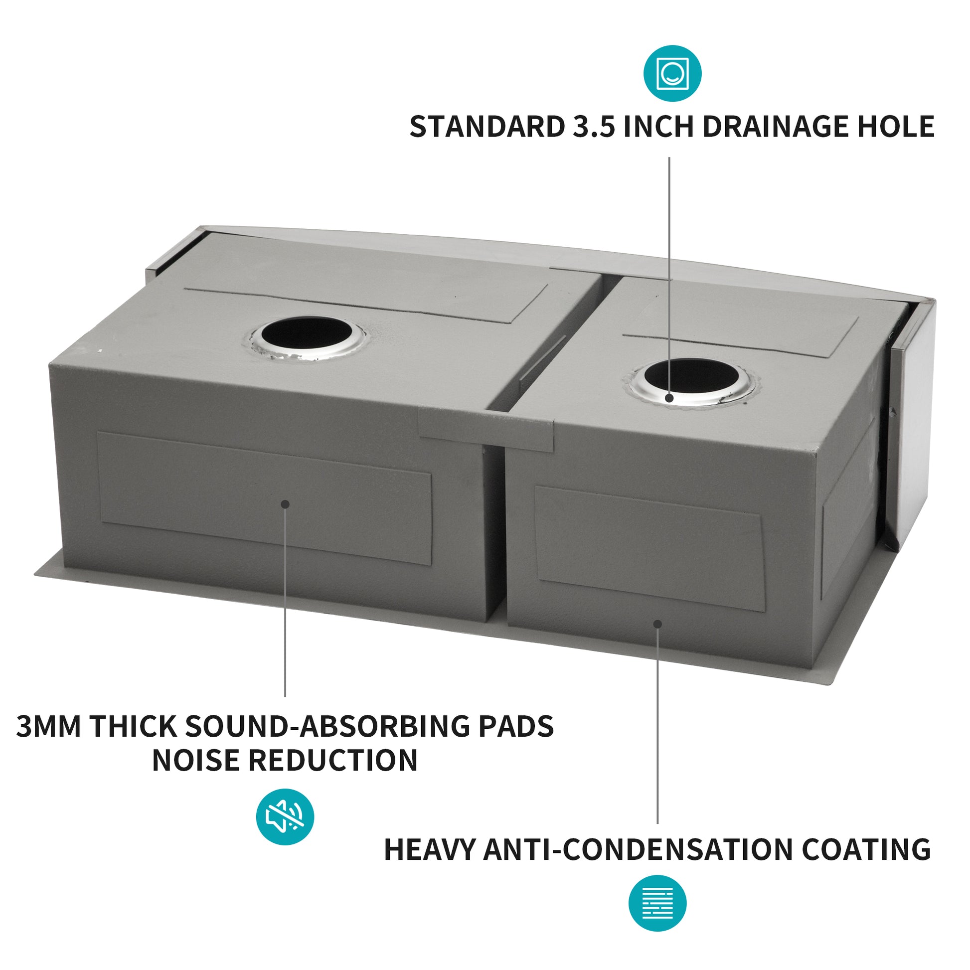 - [Fast Drainage & Sound Dampening] The double bowl farm kitchen sink features an X-shaped drainage design and a gently sloped bottom to prevent standing water and ensure faster drainage. Rubber pads and a full back coating enhance sound dampening.