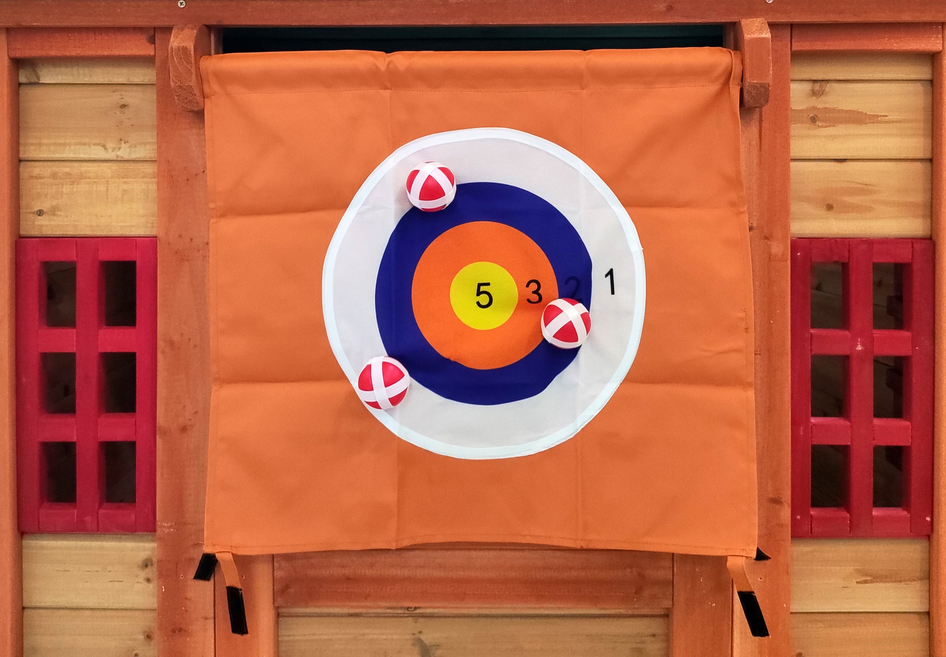 - 4-in-1 GAMES: 1. PLAY TIC-TAC-TOE Enjoy a game of Tic-tac-toe on the door 2. PACHINKO AND TETRIS GAMES Use the ball wall to play exciting pachinko and Tetris games 3.TARGET TOSS Play a game of darts using plastic balls 4.CHILL OUT The game house nook is a relaxing treat after a day of outdoor play