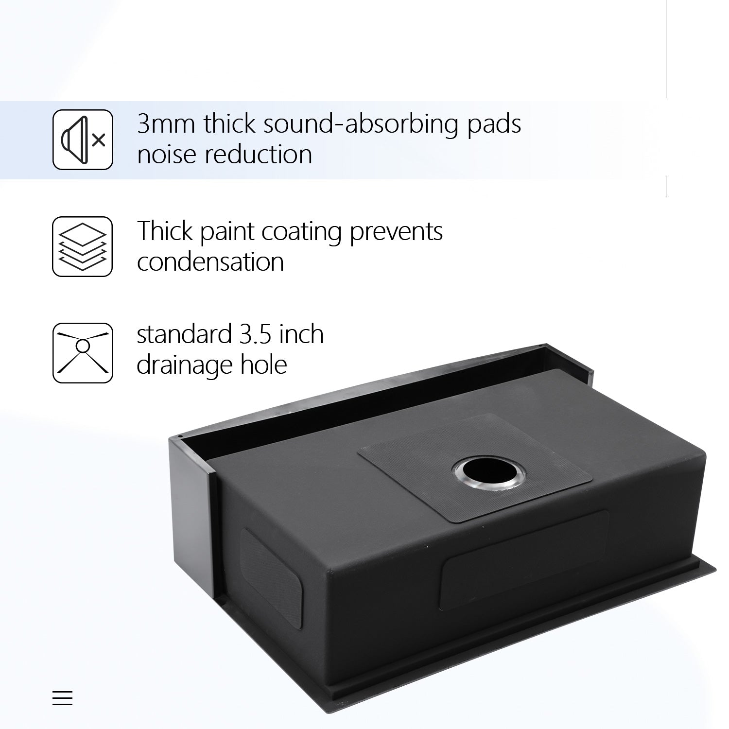 - There is 3mm thick rubber noise reduction around the bottom of the stainless steel sink, non-toxic and odorless anti-condensation coating. Reduce noise and prevent water droplets from alternating hot and cold from dripping down into the cabinets, protecting your cabinets.