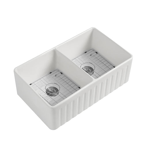 Fireclay 33" L X 20" W Double Basin Farmhouse Kitchen Sink With Grid And Strainer