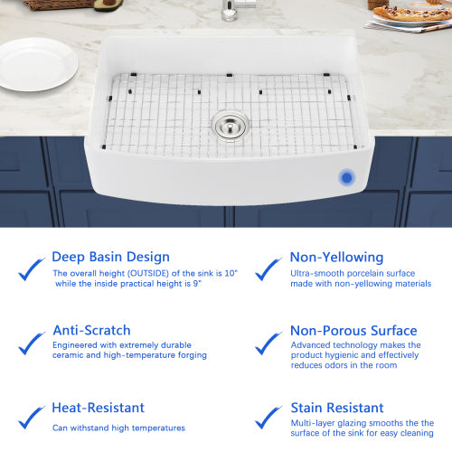 Fireclay 33" L X 20" W Farmhouse Arch Edge Apron Front Single Bowl Kitchen Sink