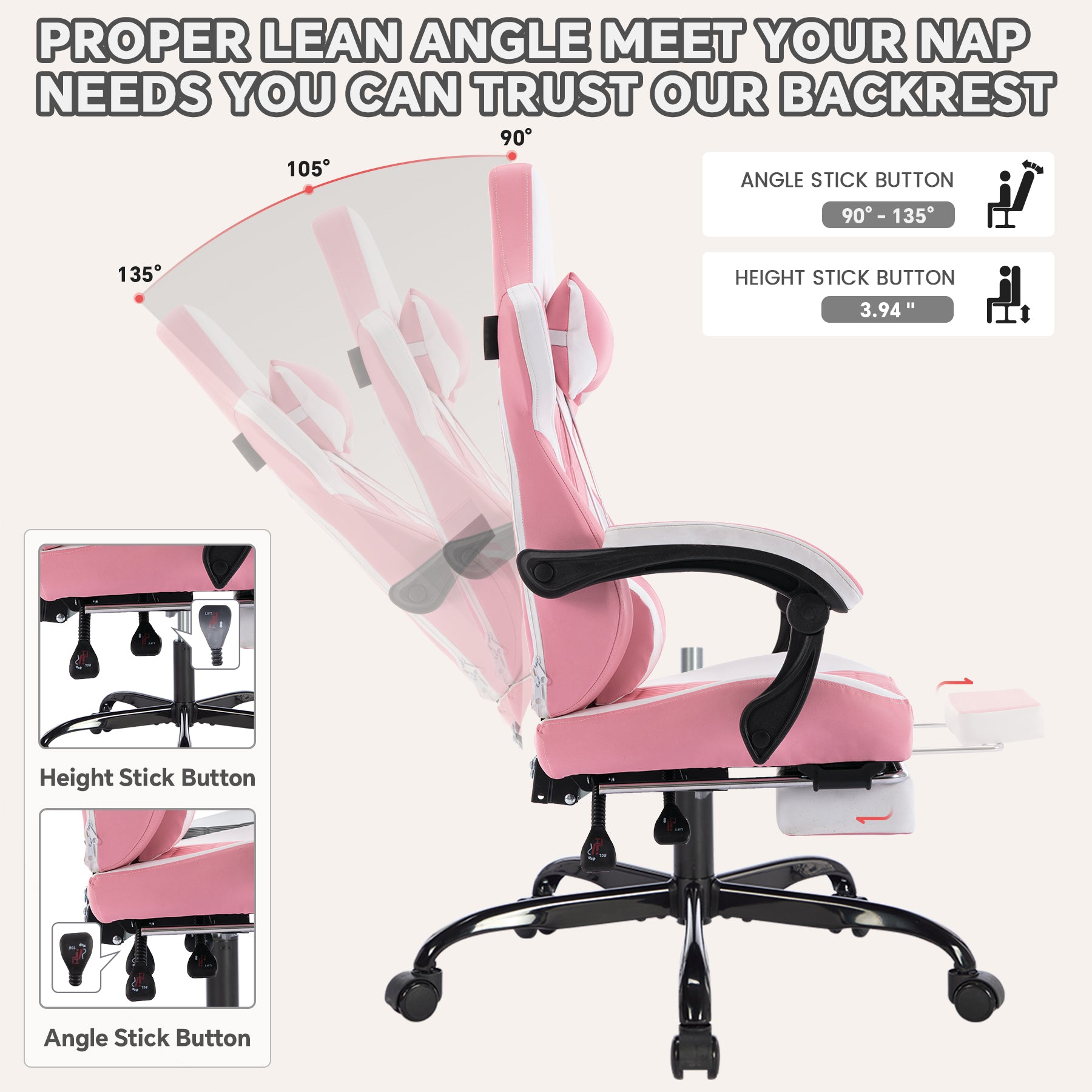 - Versatile Adjustments: This gaming chair offers a variety of adjustable features, including 360-degree swivel, multi-directional casters, 90° to 135° tilt angle, and retractable footrest, making it easy to adapt to different sitting postures. Whether you are working, resting, reading or taking a nap, you can find the most comfortable sitting position through personalized adjustment