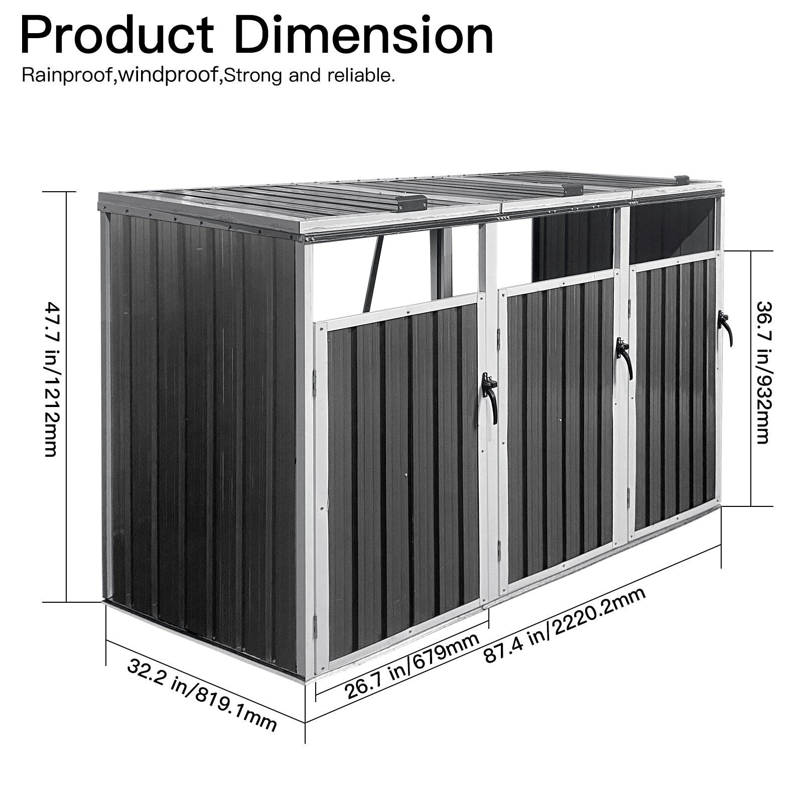 - [Dimension] This outdoor storage shed which is enough to fit three large trash cans without worrying about the lack of internal storage space.
