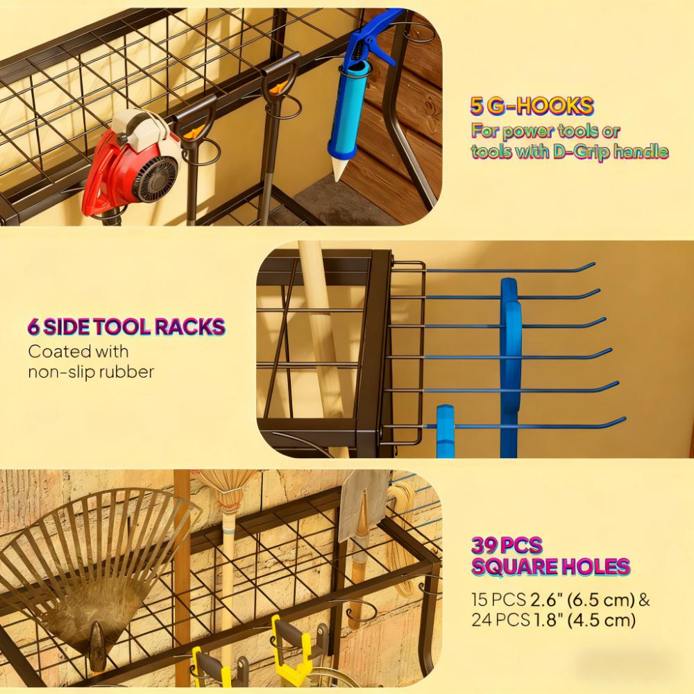 - - Multi-Purpose Organizer: This shed organizer features five G-hooks for power tools like string trimmers and D-grip handles, six side racks for hand tools and a spacious bottom shelf for additional storage, keeping your tools easily accessible.