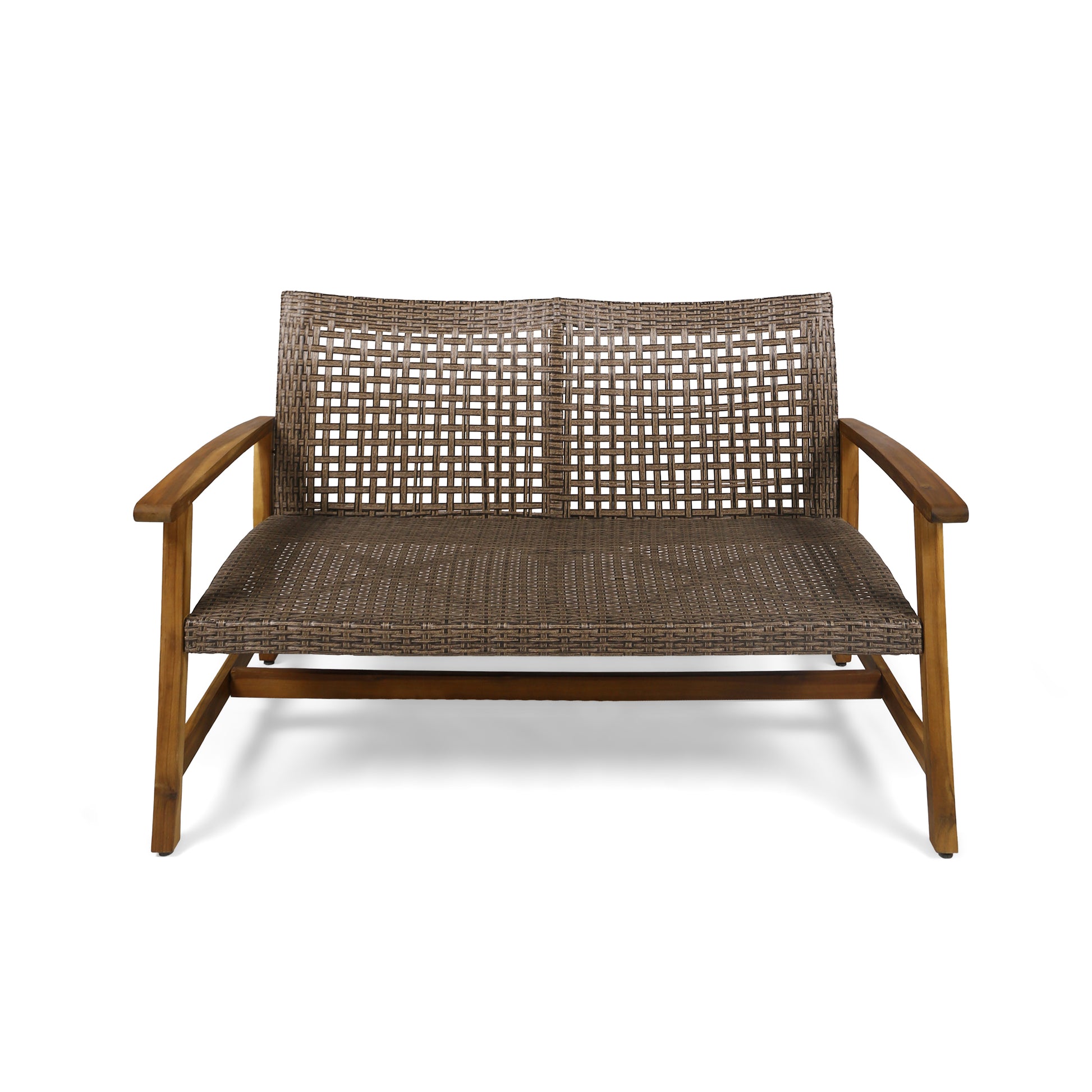 - ACACIA WOOD WITH COMPLEMENTING FINISH: This frame consists of an acacia hardwood that accents the wicker seat. This material is washed with a complementing finish and maintains a sturdy foundation for the loveseat that can withstand most weather conditions.