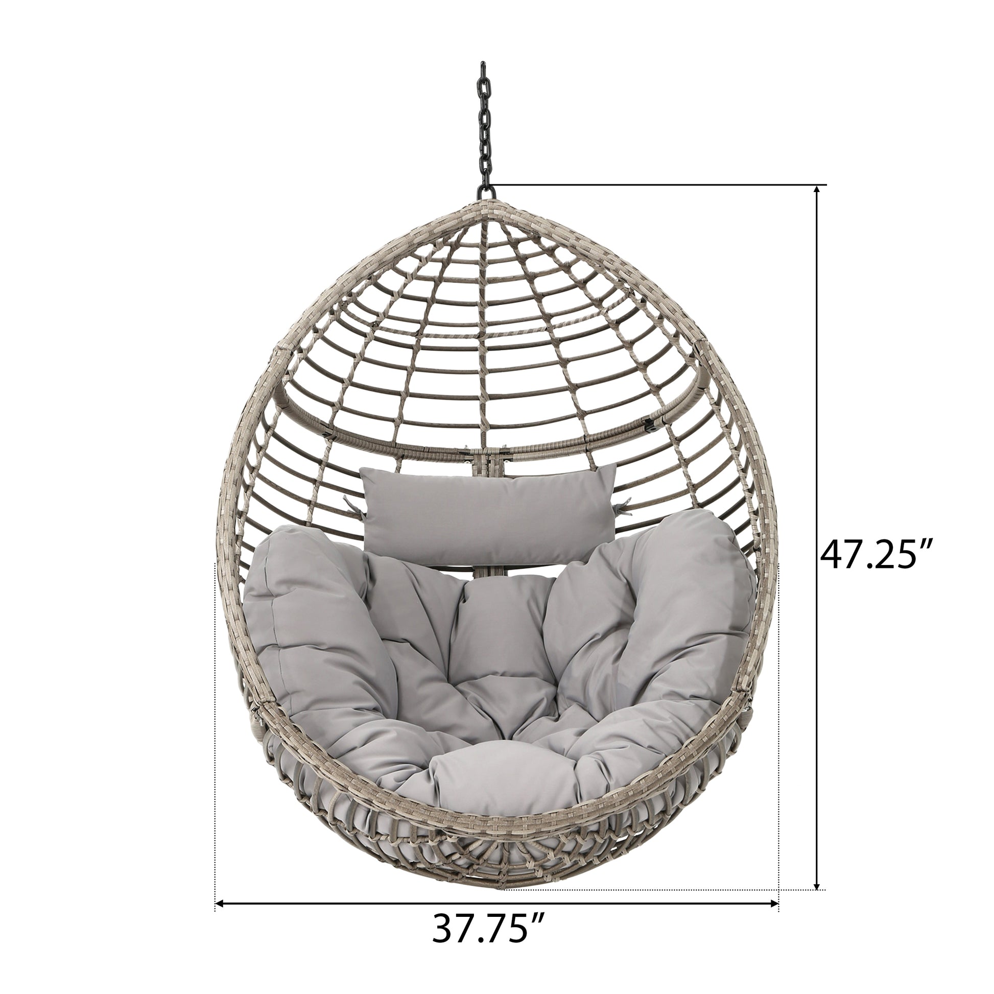 - Offer your home the perfect hanging chair addition that will instantly enliven any outdoor or indoor space. Featuring a cozy basket shape, this charming accessory gives your patio or living room a refreshing transitional look and offers incredible comfort. This is constructed with a beautifully wrapped wicker weave and a sturdy metal frame, allowing you hours of much-needed leisure whenever needed. Finished with plush water-resistant cushions, this piece can be used indoors and outdoors, making