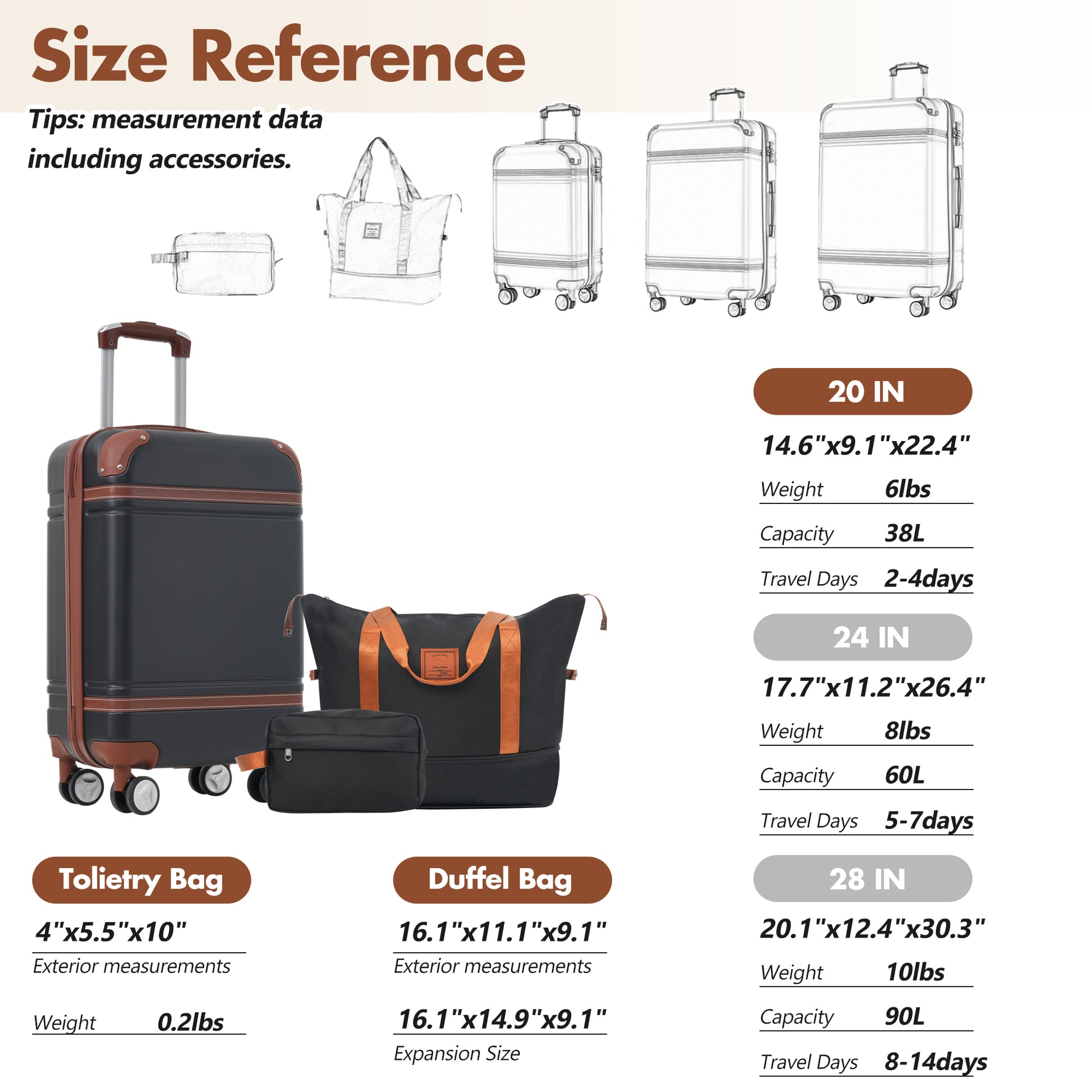 - Size:20 IN carry-on luggage dimensions(included accessories): 14.6"x9.1"x22.4"; Expandable travel bag dimensions :longest length: 23", shortest length: 16.1", width: 9.1", height(without extension): 11.1", expansion part height: 3.8";Toiletry bag dimensions: 10 "x5.5"x4".