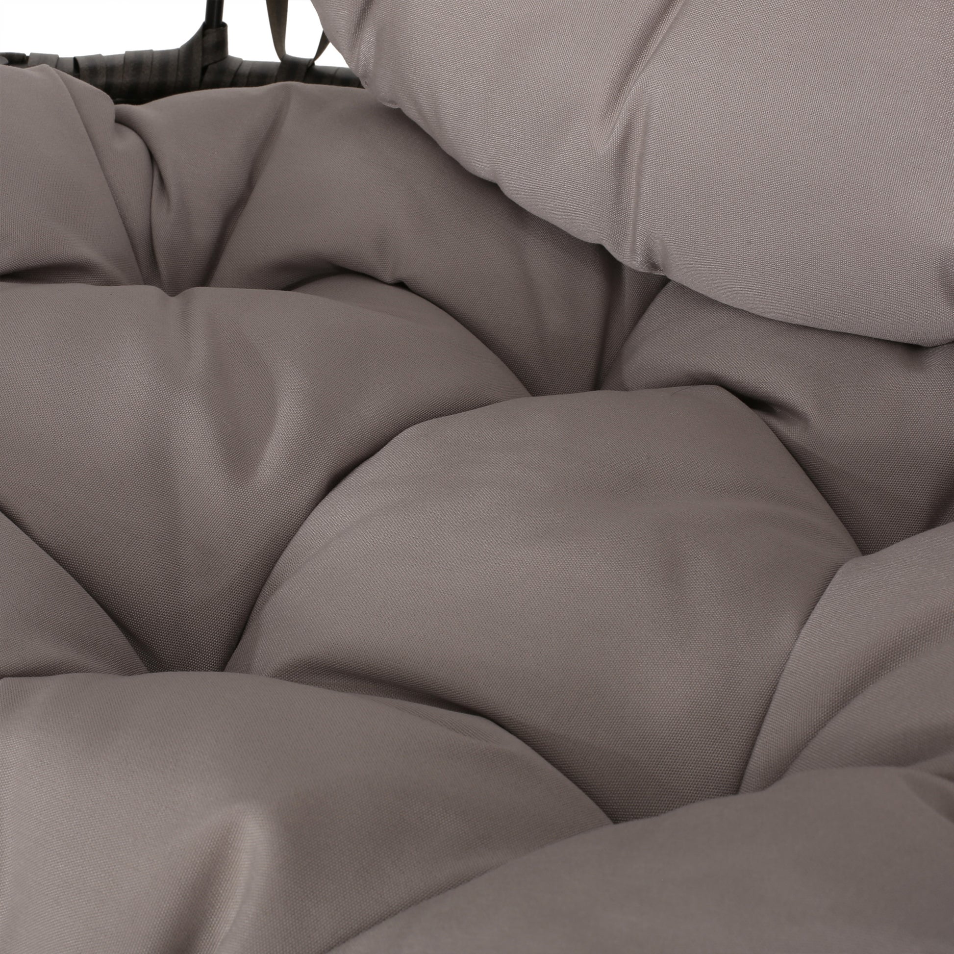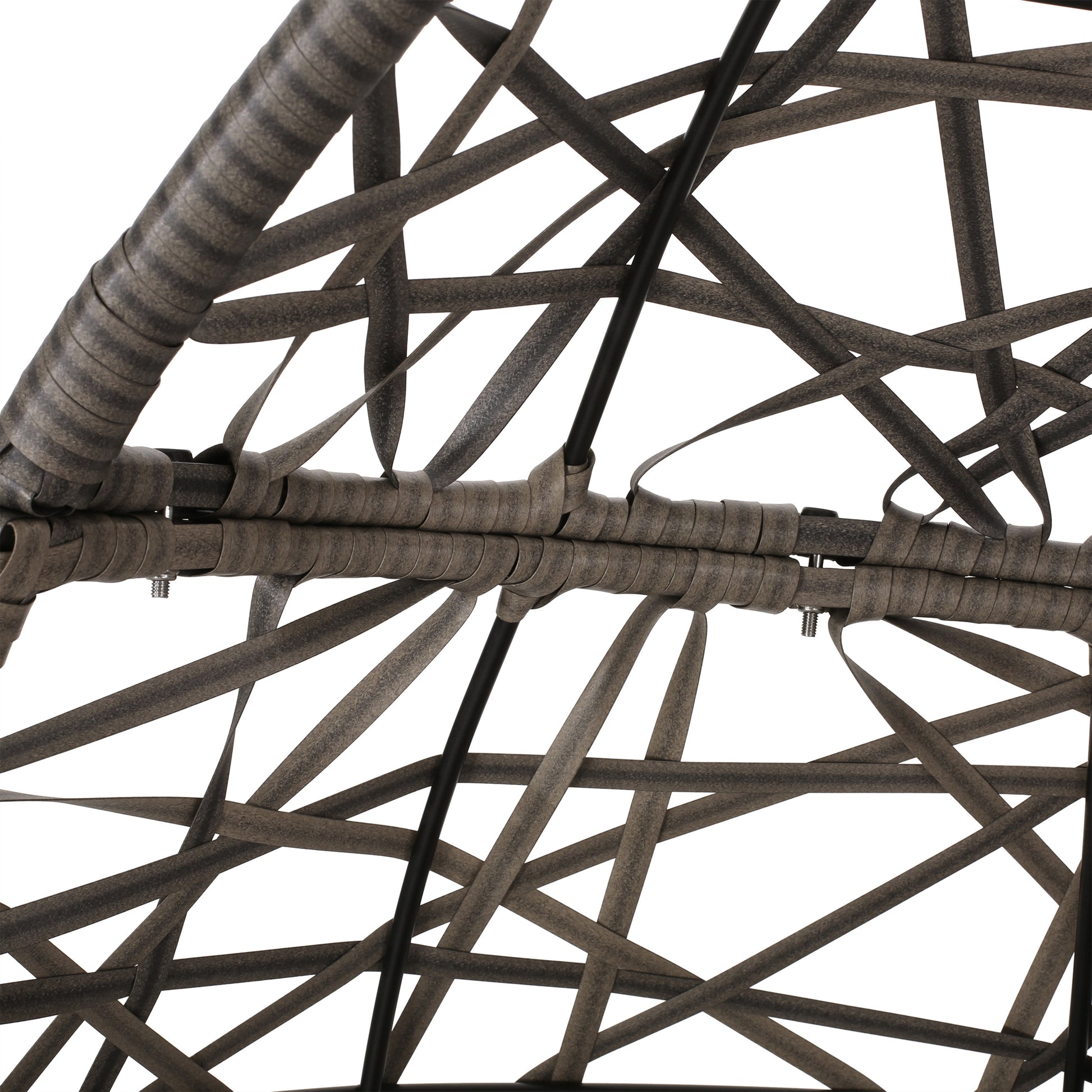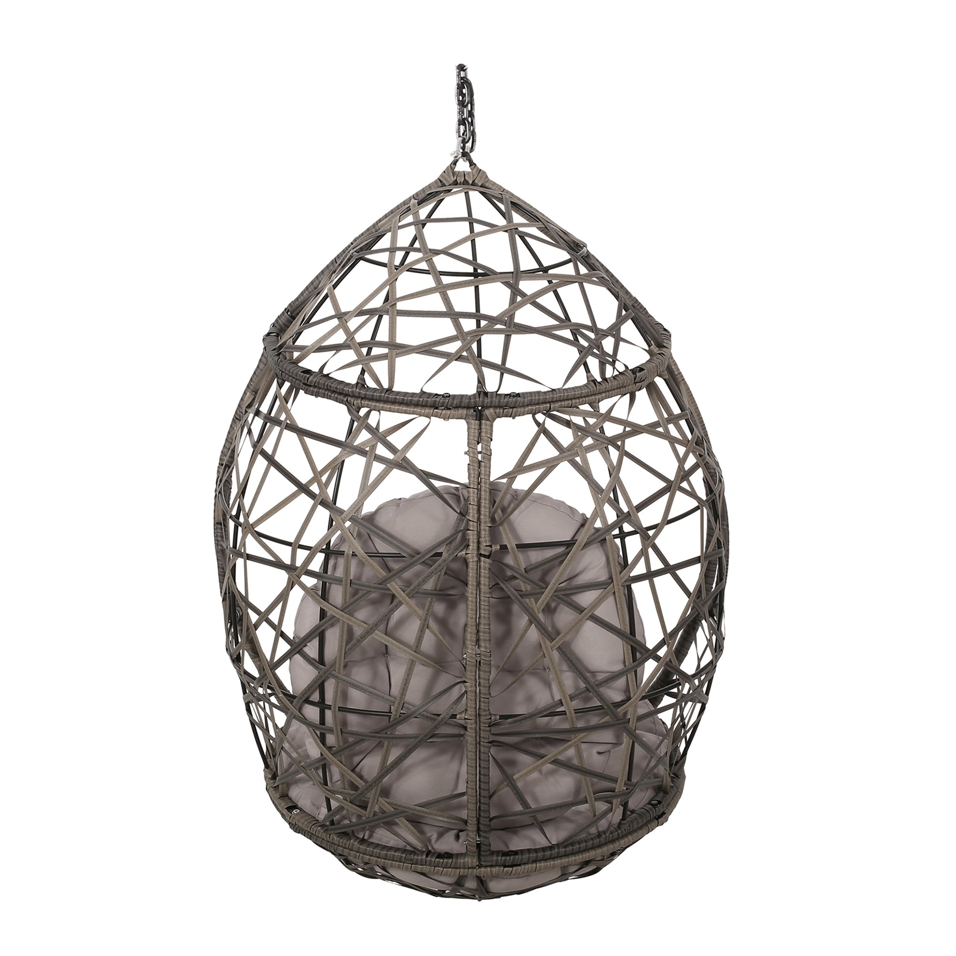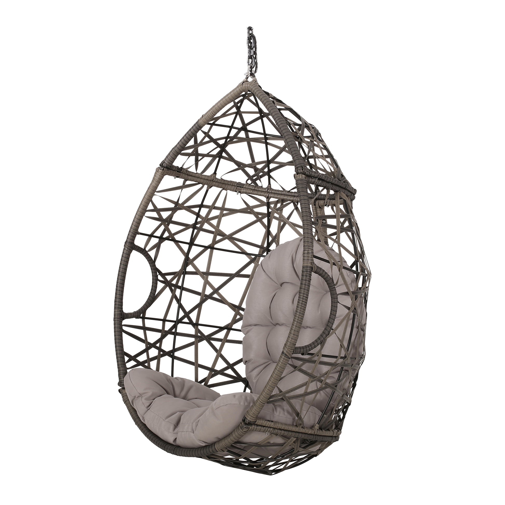 - Transform your living space with a delightfully trendy hanging chair of charming style and coziness. Featuring an elegant teardrop shape with beautifully wrapped wicker weave and a sturdy metal frame, this lovely accessory not only gives your patio or living room a refreshing transitional look but also offers incredible comfort. Finished with plush water-resistant cushions, this piece can be used both indoors and outdoors, making this a truly extraordinary addition to your lounge space.
