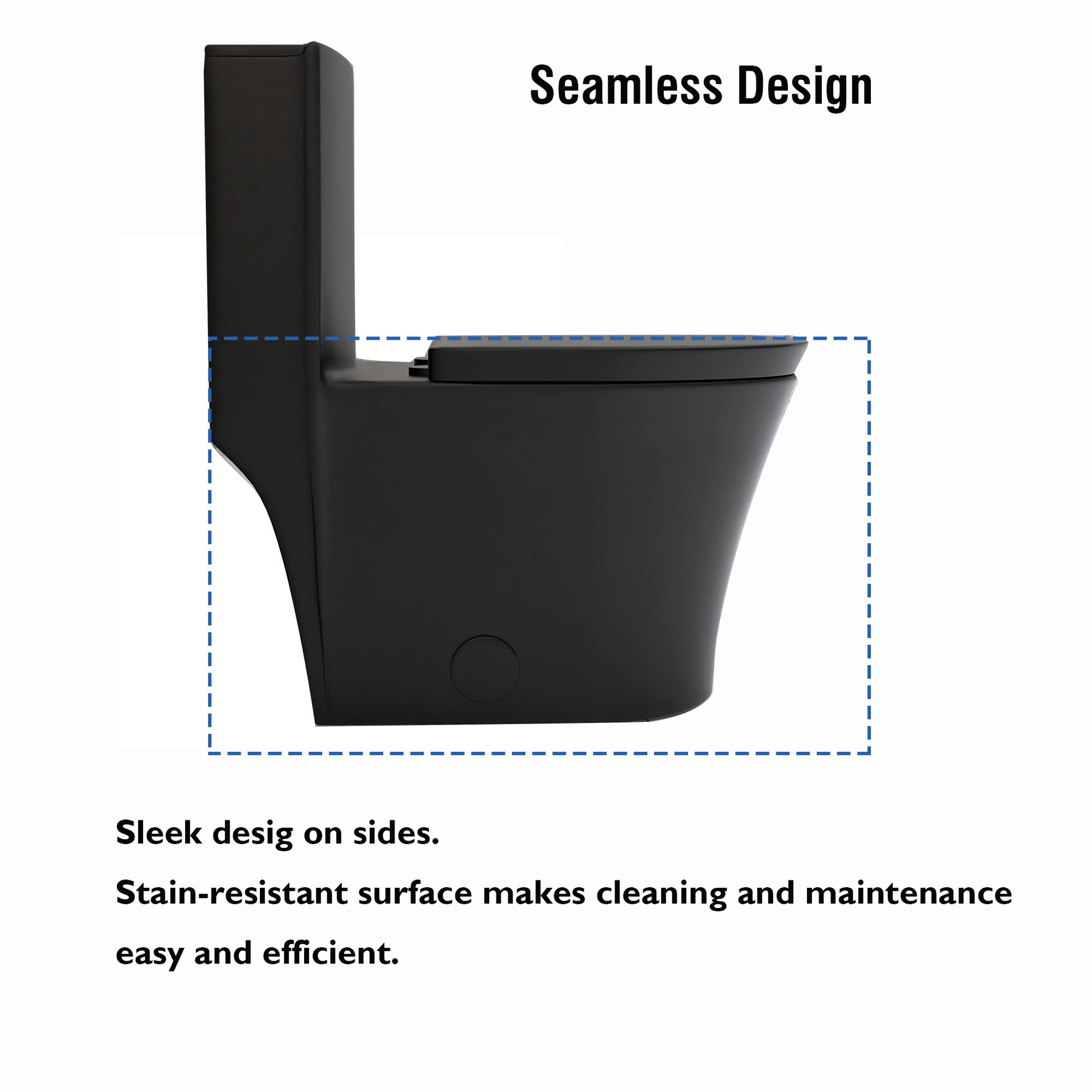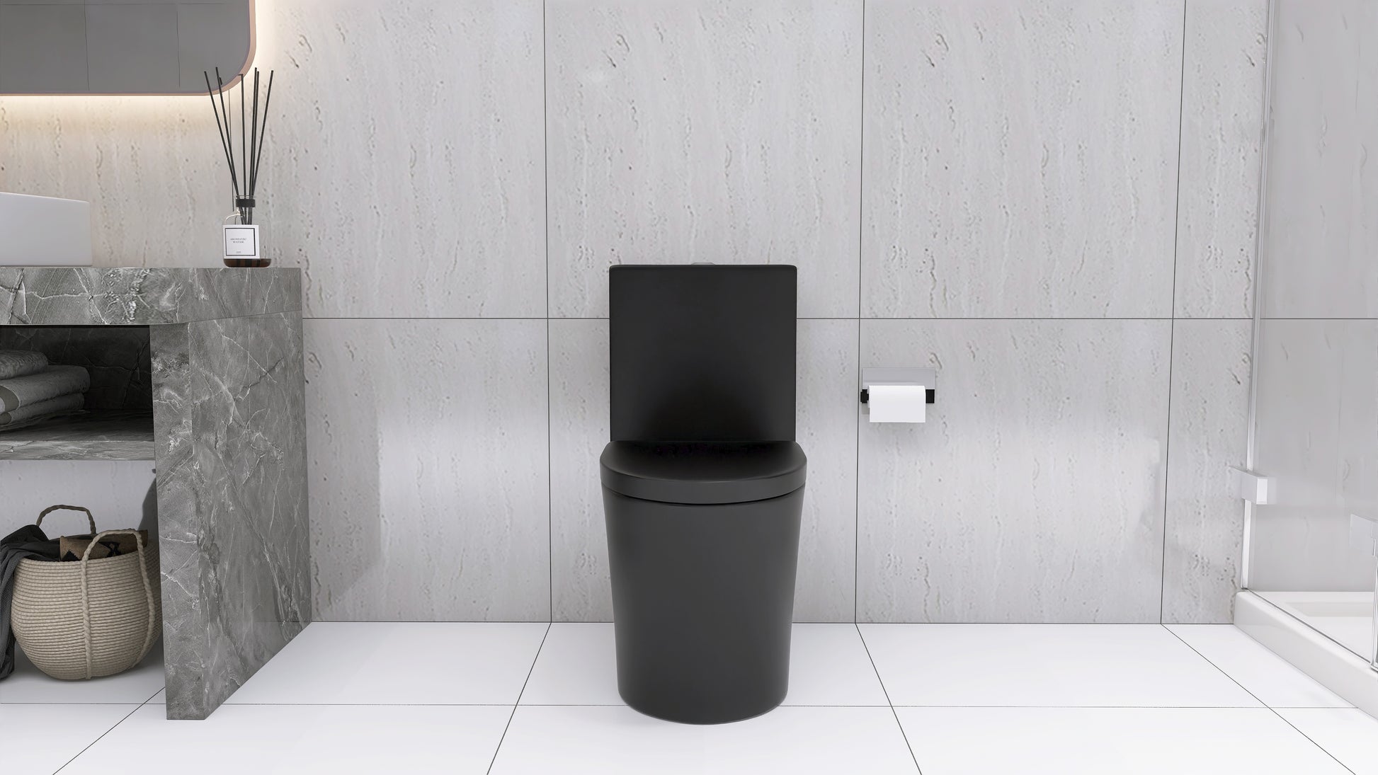 - Sleek Skirted Design:The matte black toilet features a modern skirted design with a concealed, fully glazed trapway, offering a contemporary and clean style that seamlessly fits into most modern bathrooms.