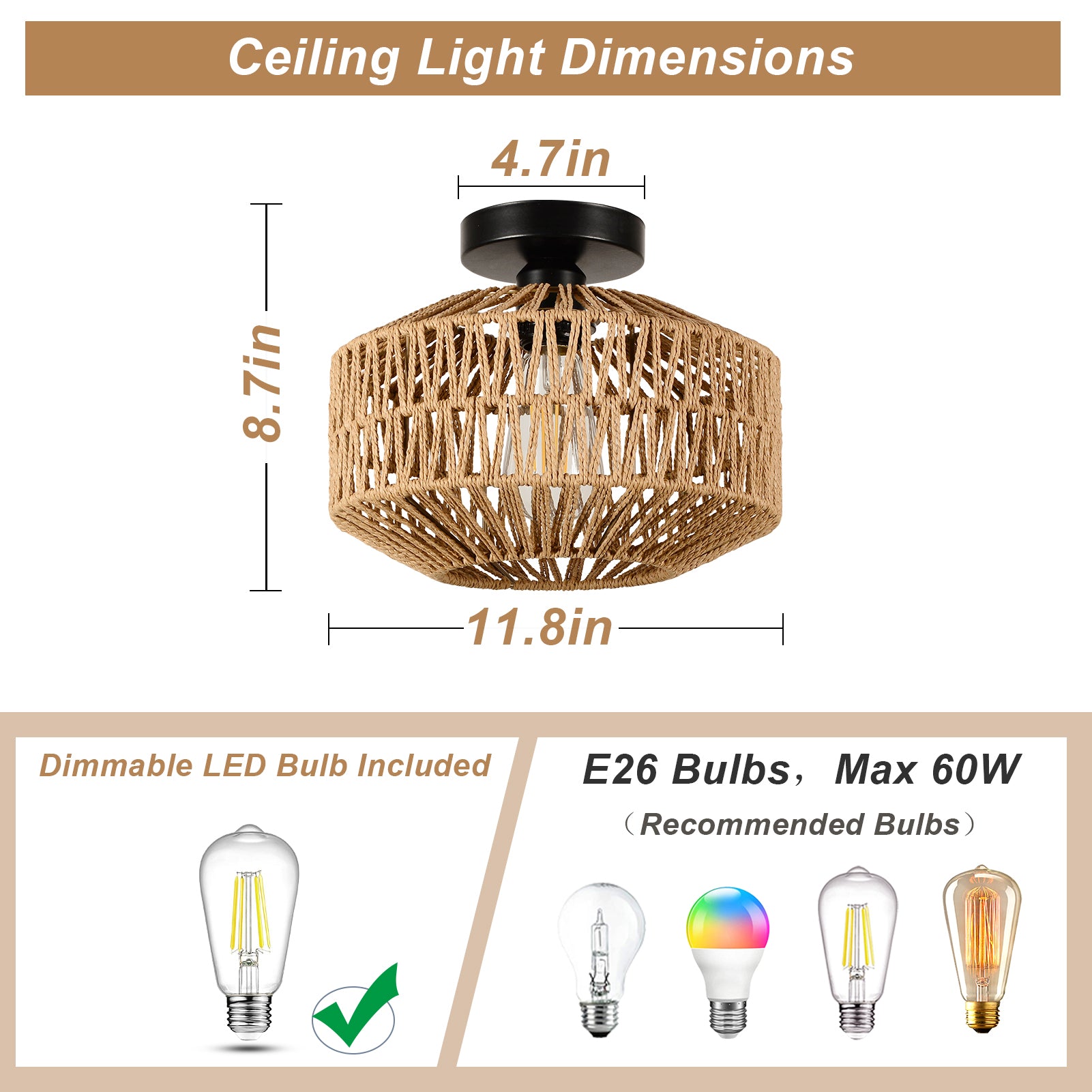- [ Easy to install ] The overall structure of the wicker light fixture is very simple, You only need to fix the lamp base and the lampshade together, then wire the ceiling light fixtures flush mount to the home circuit, and install the light bulb to get a perfect boho ceiling light,The whole process to install this close to ceiling light fixtures is even less than 15 minutes!