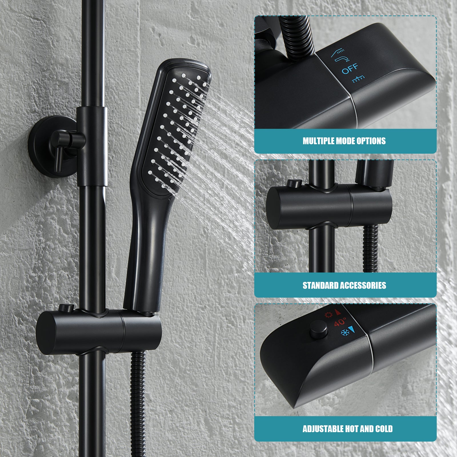 This thermostatic complete shower system with a rough-in valve is ideal for any bathroom. The dual-function thermostatic control allows easy switching between the showerhead and hand shower while maintaining the desired temperature throughout the shower. It offers 3-different spray patterns-Full/Standard, Massage/Jet and Rain-which can be adjusted according to your preference, ensuring a pleasant shower experience. The system includes a bar with an adjustable-height hand shower holder. Each shower hardware kit is rigorously tested with both water and air to prevent leaks. With included hardware and US-standard fittings, installation is straightforward. Additionally, the adjustable flow rate allows you to customize the water flow to your needs.