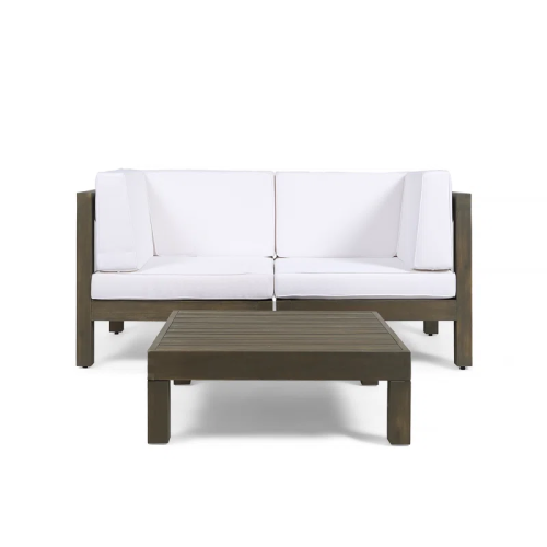 - Includes: One (1) Right-Arm Piece, One (1) Left-Arm Piece, One (1) Coffee Table. Frame Material: Acacia Wood. Cushion Material: Water-Resistant Fabric.