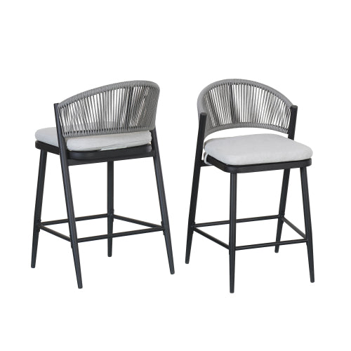 Outdoor 26" Seat Height Metal Frame Counter Stools with PE Rattan Scallop-shaped Backrest, Set of 2, Matte Black