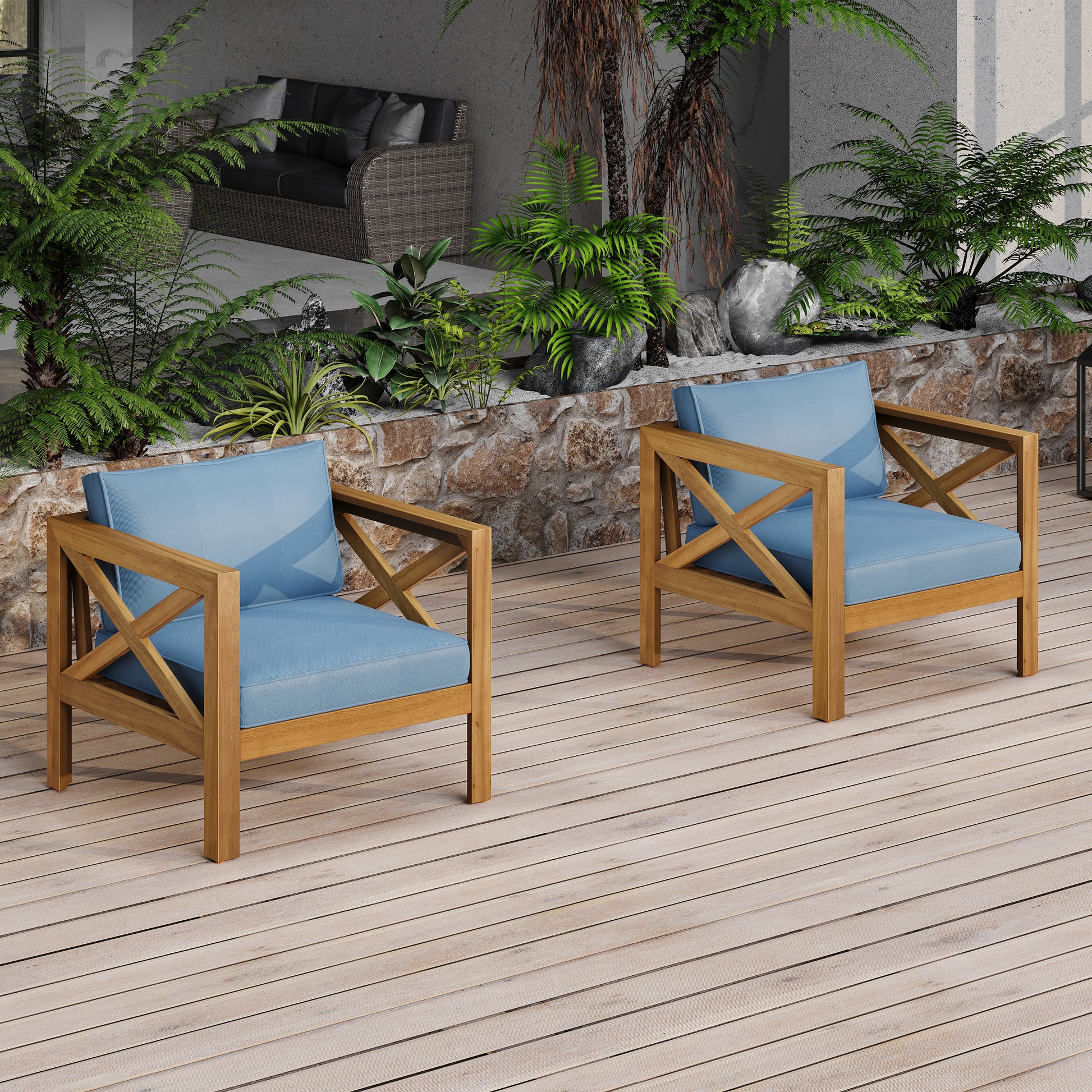 Outdoor Acacia Wood Club Wooden Armchair with Cushions (Set of 4), Conversation Set,Suitable For Outdoor Gatherings,Teak Finish,Blue cushion