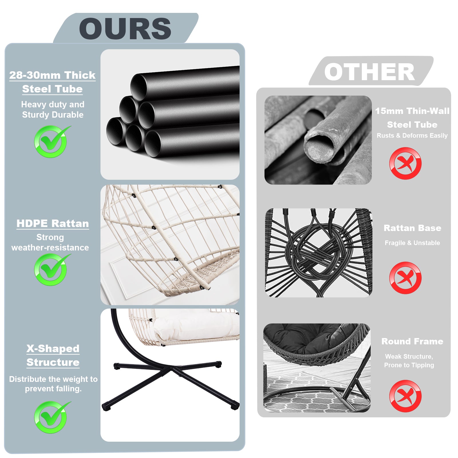 - Consisting of an aluminum-steel frame and a sturdy heavy-duty steel 1:Consisting of an aluminum-steel frame and a sturdy heavy-duty steel stand, it ensures that the egg chairs will not rust and extend their life, and the sturdy stand provides stable support and is stable enough on any ground.