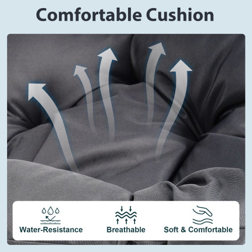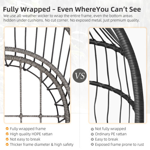 - Hand-woven and Finished Bottom. Hand-bent rattan creates a stunning sculptural frame and egg seat that cradles you in all the right place as you float a few feet above the ground. The quilted cushions are outdoor-friendly. A point not to be underestimated is the bottom is already finished woven and non-cut out,so even without a cushion, you can enjoy relaxing and cooling in the chair.
