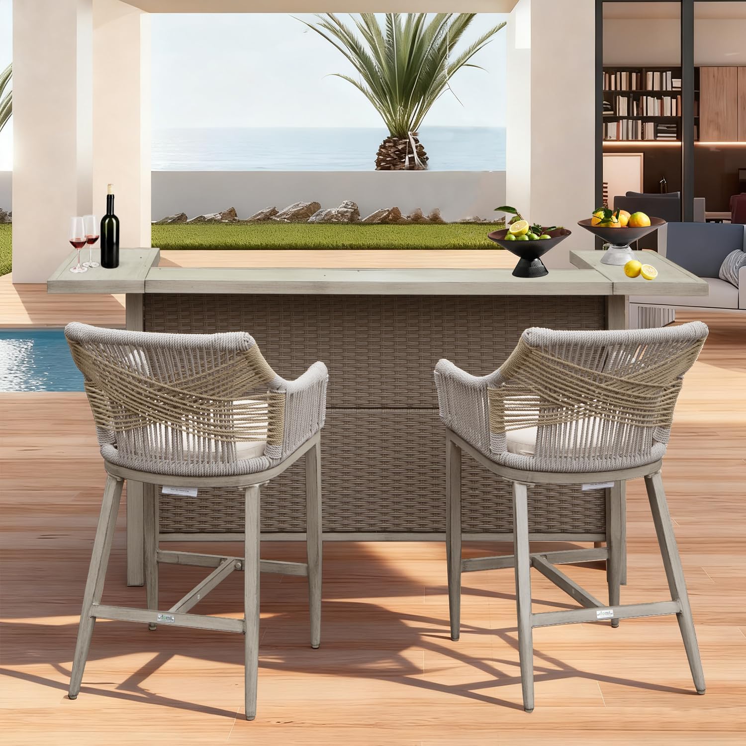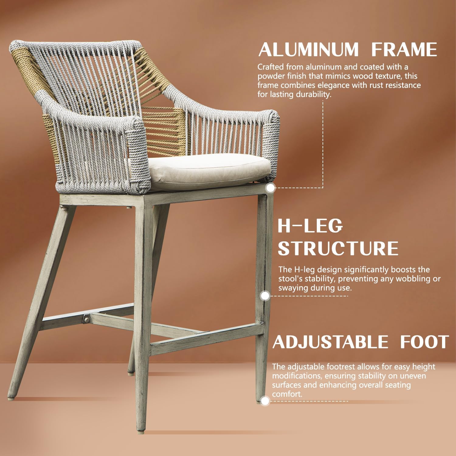 - Sturdy Aluminum Frame:The bar stools feature a high-quality aluminum frame with a wood-like powder coating that is corrosion-resistant and rustproof. The H-shaped frame enhances stability, and the slightly extended rear legs provide excellent support, ensuring the stool remains stable when leaning back.
