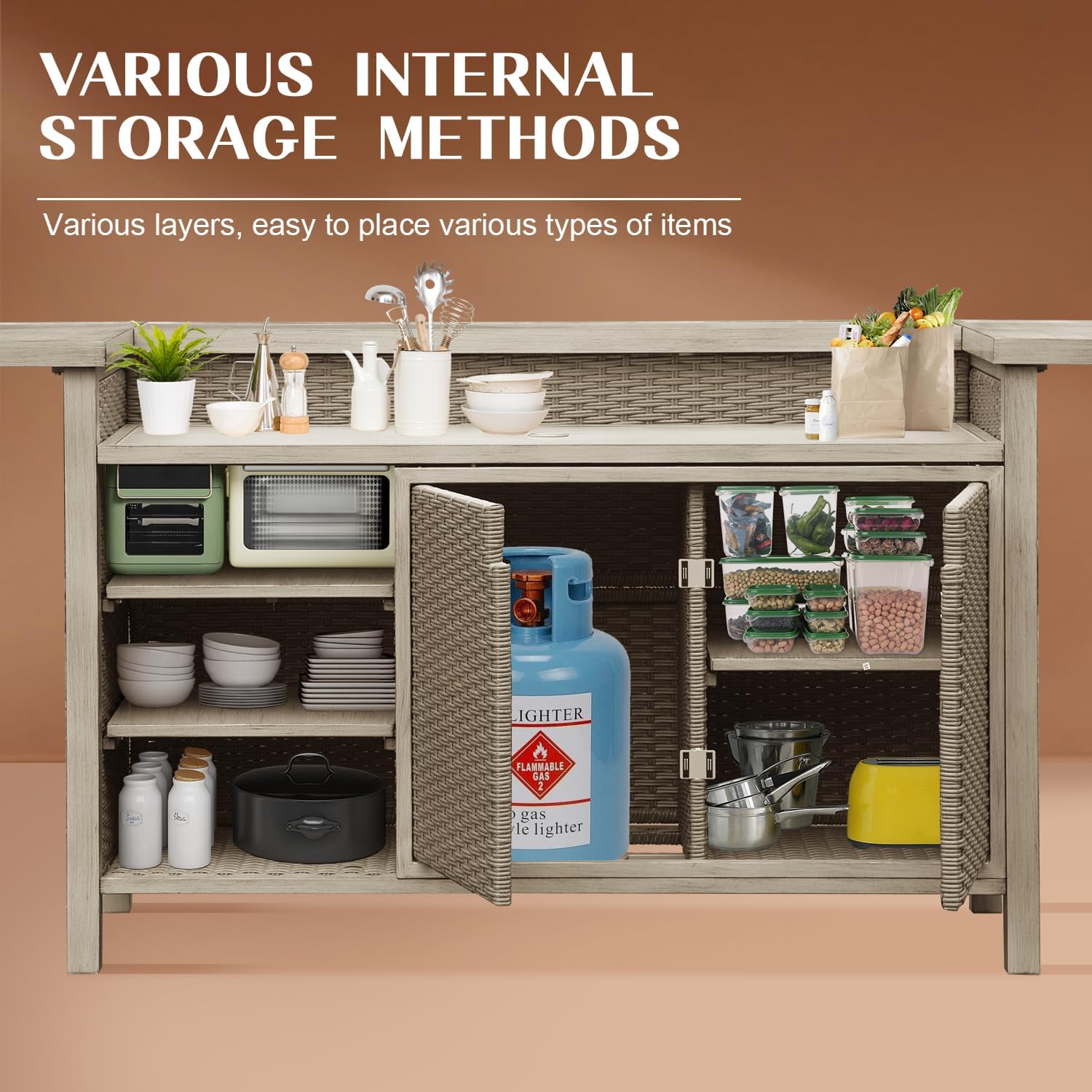 - Gas Tank Compatibility: A built-in gas tank support bracket keeps your propane tank secure and hidden, making this outdoor kitchen bar island an ideal partner for outdoor grilling.