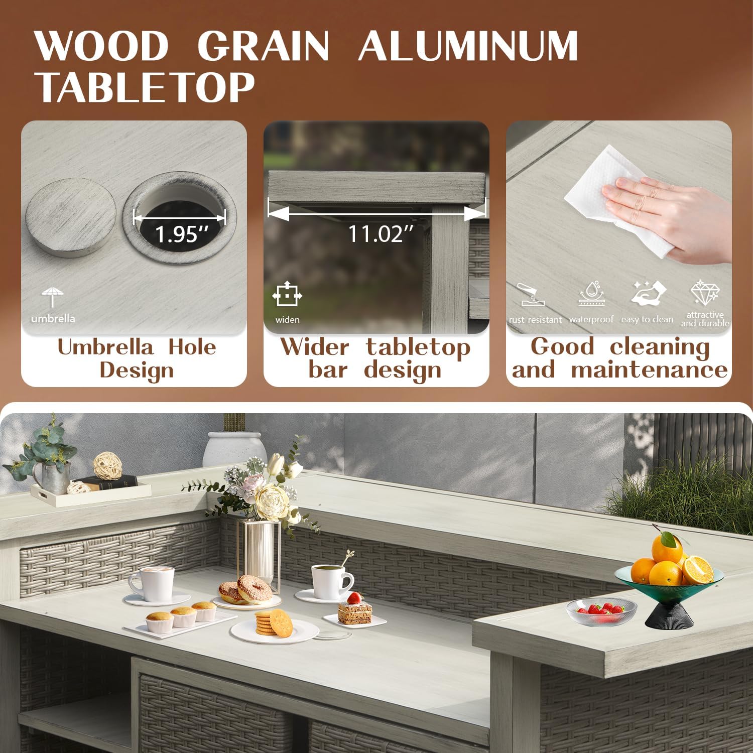 - Premium Material Combination: With high-quality PE wicker, this outdoor garden table boasts a vintage modern look. UV-resistant and weatherproof, it's easy to clean. The wood-grain aluminum frame resists rust and deformation, ensuring long-term durability