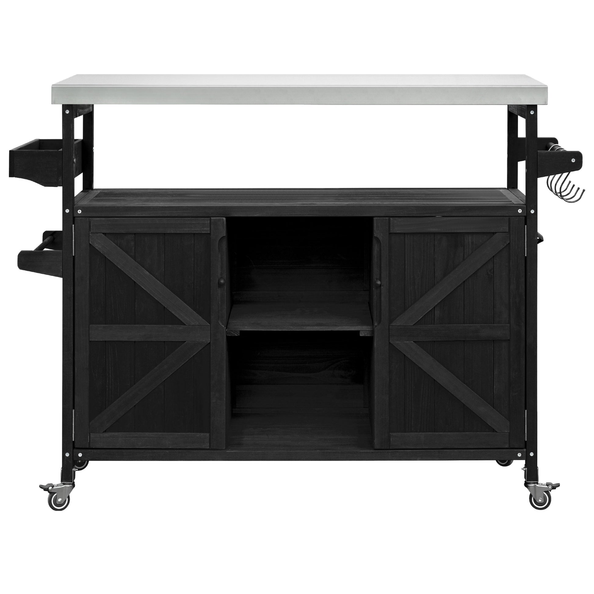 Outdoor Kitchen Island, Rolling Bar Cart & Storage Cabinet, Farmhouse Solid Wood Outdoor Grill Table with Stainless Steel Top, Spice Rack , Towel Rack for Kitchen & Barbecue, Black