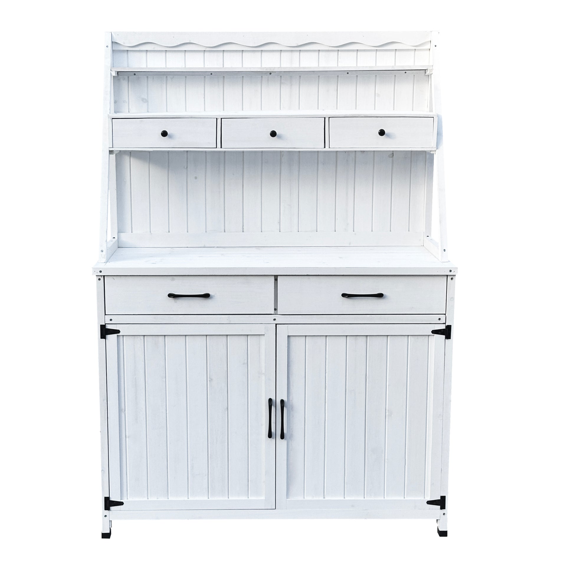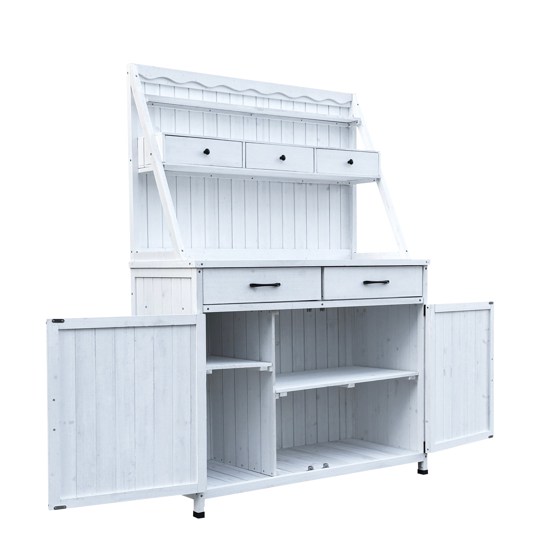 - Designed for convenience, this potting table with shelves includes 3 drawers for storing small tools and two middle cabinet with a removable shelf for larger items. The 64.5-inch countertop height provides comfortable working space, and you can even add a chair for seated tasks, making it a practical outdoor potting bench for extended use