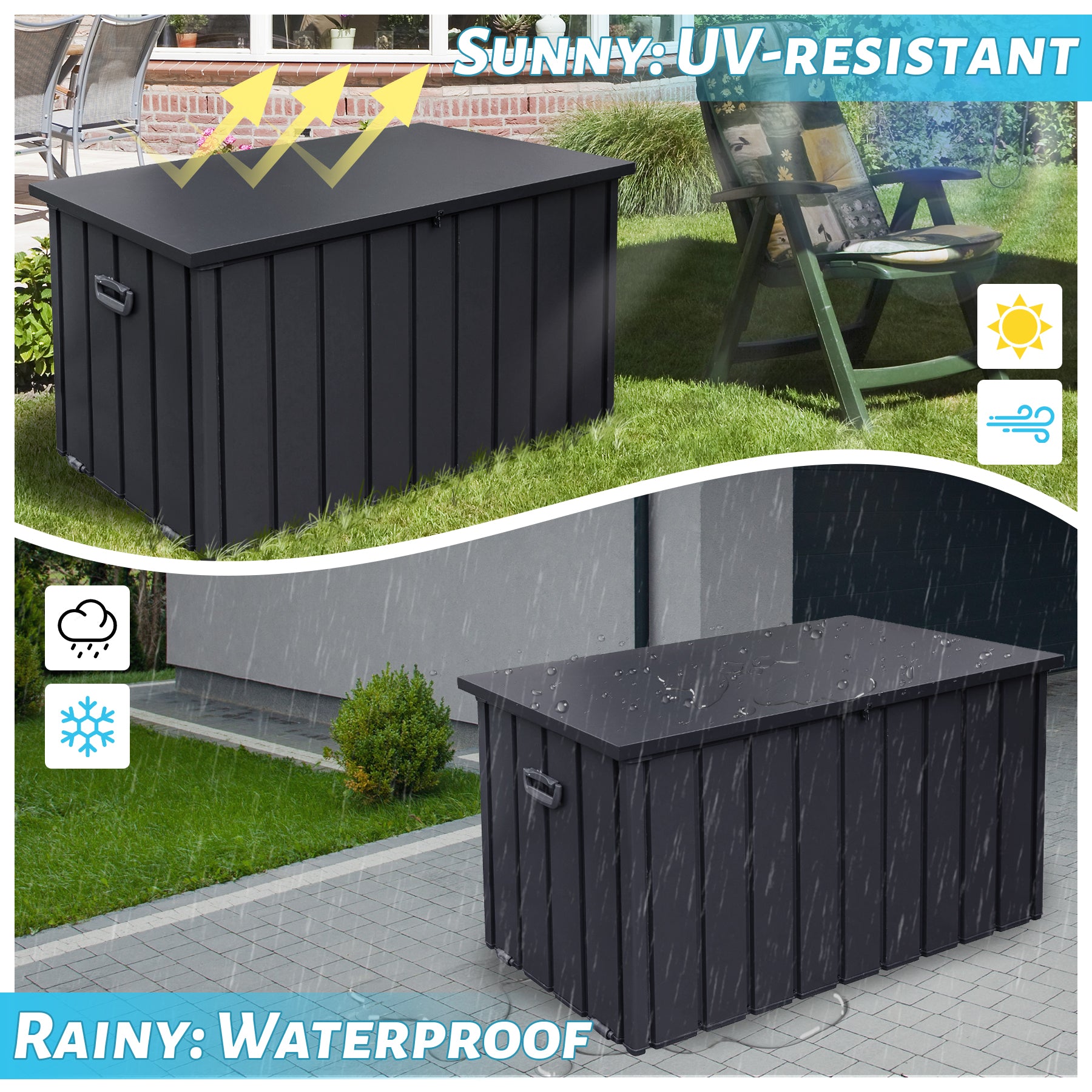 - ALL-WEATHER RESISTANT WATERPROOF STORAGE BIN - The weatherproof tools deck box features excellent rust-resistant and UV-resistant functions. No matter whether it's sunny, rainy, snowy, or windy, you can safely place it outdoors, such as porch, pool, backyard, garden, patio etc