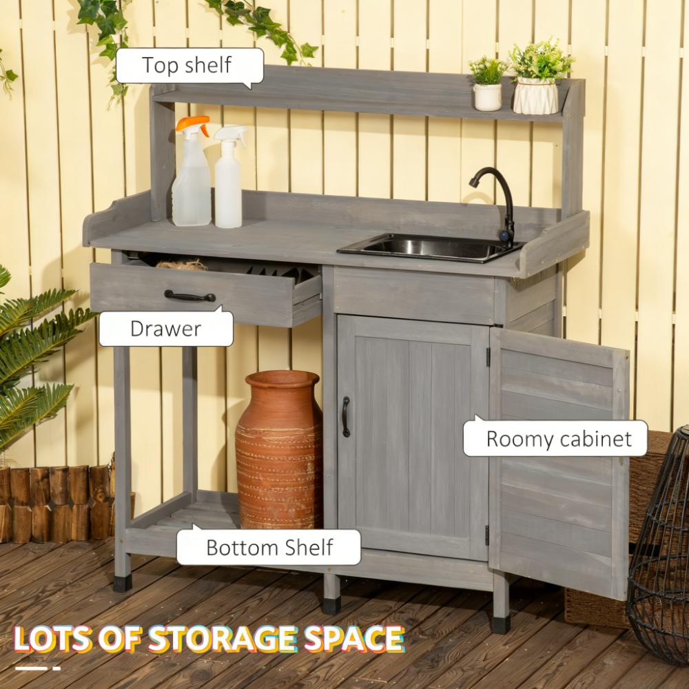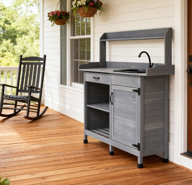 - - Removable Sink: Features an outdoor sink station with a hose hook-up. There is an inlet to connect to a water source and a basin that drains. Our potting bench allows you to water potted plants in the same place where you add soil.
