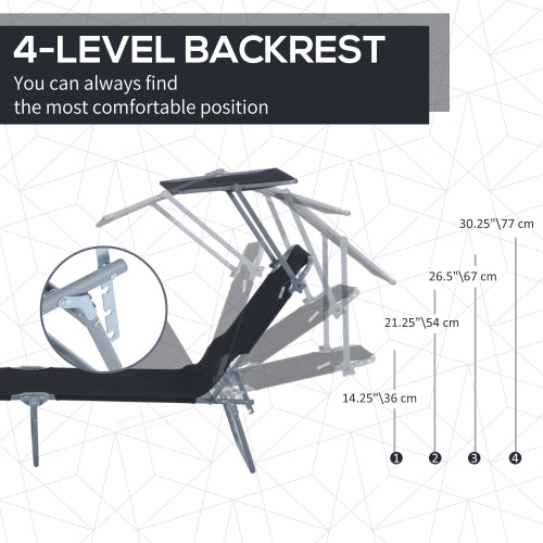 Outsunny Outdoor Lounge Chair, Adjustable Folding Chaise Lounge, Tanning Chair with Sun Shade for Beach, Camping, Hiking, Backyard, Black