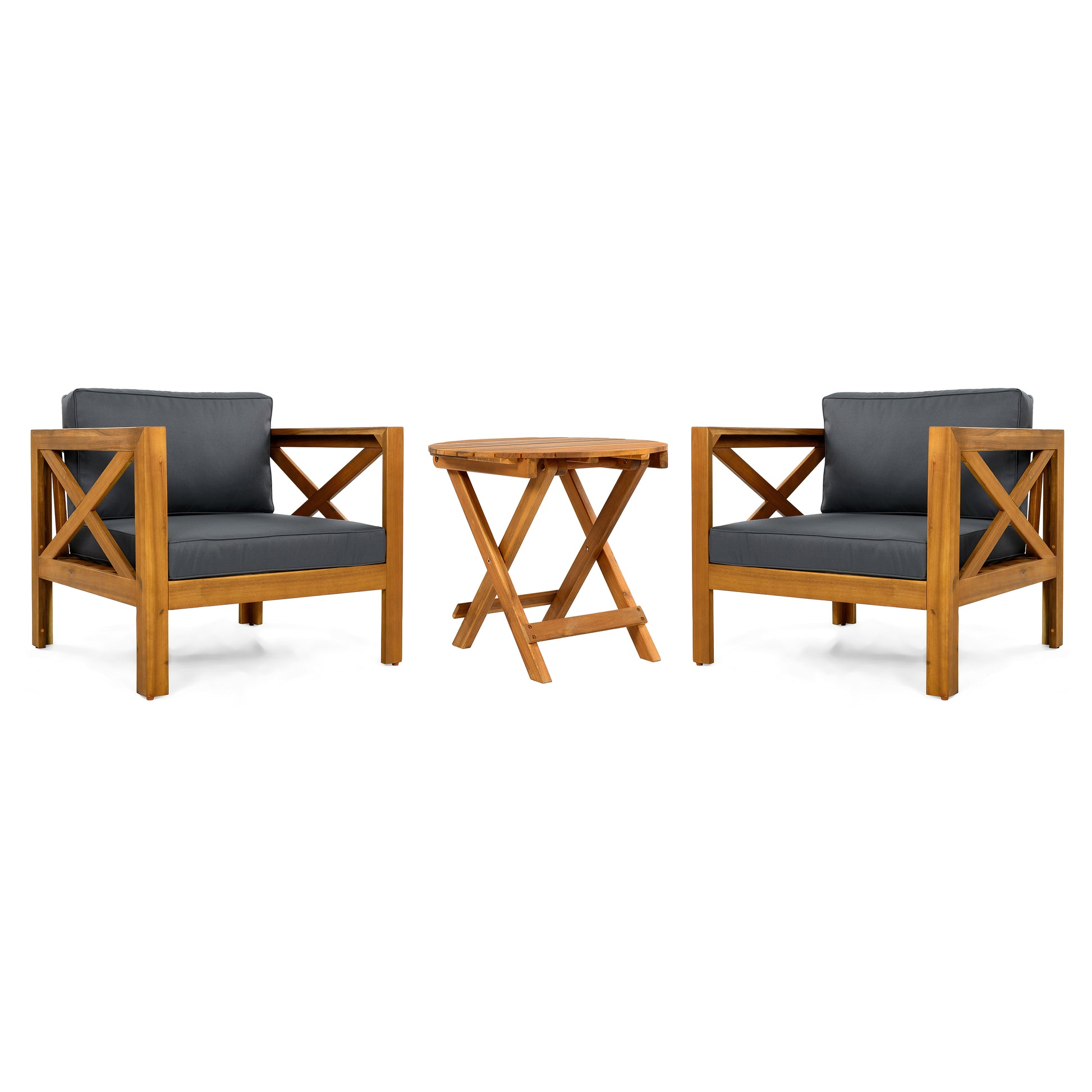 - PACKAGE INCLUDING:This product contains a set of 2 chairs (With Dark Grey Cushion)and 1 foldable acacia wood table.