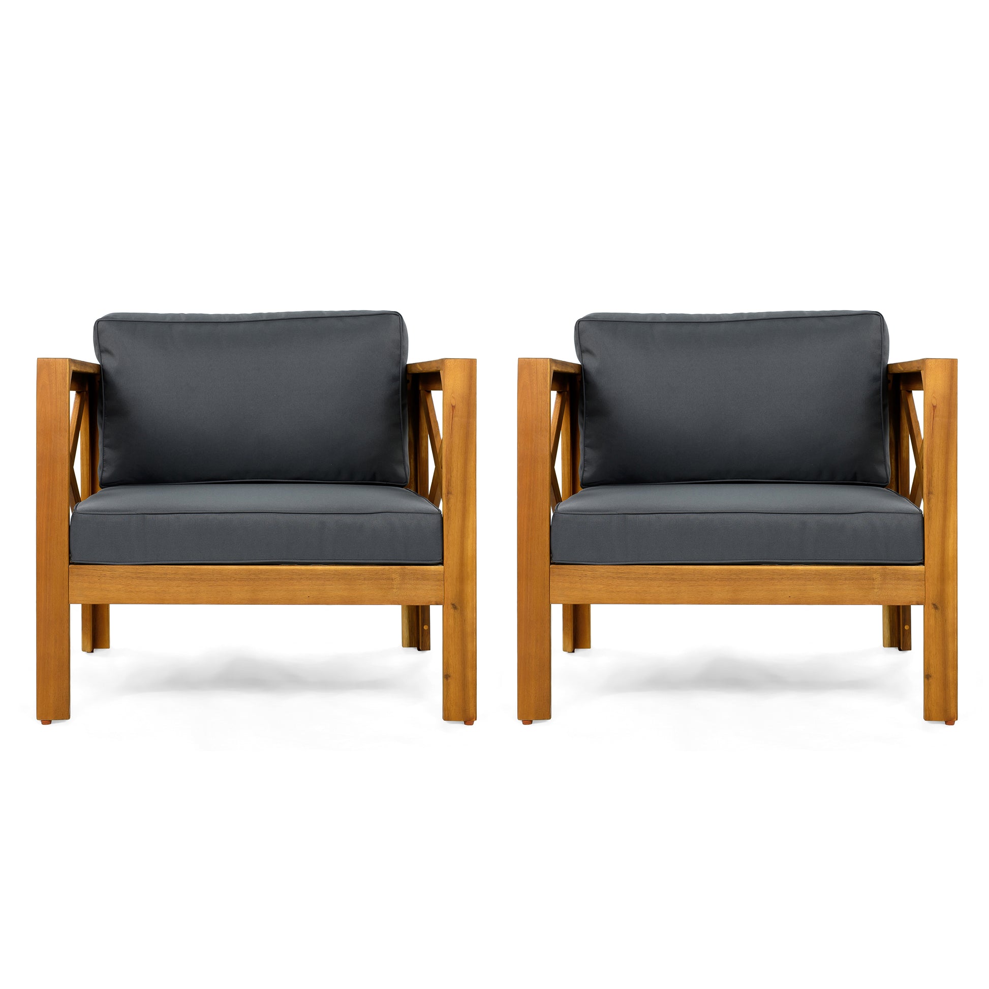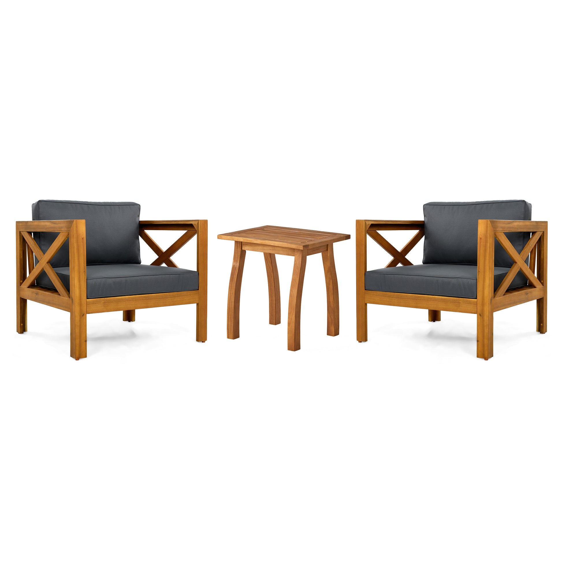 Patio Conversation Set, Outdoor Wood Leisure Seat(Set of 2),Armchair with Cushions,Selma Acacia Wood End Table ,Teak Finish,Dark Grey cushion